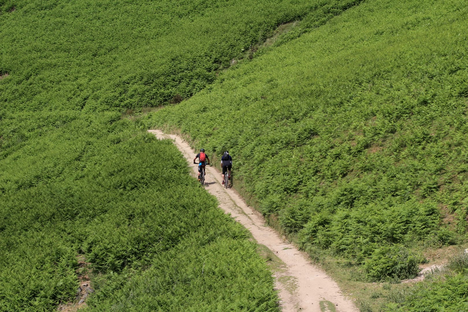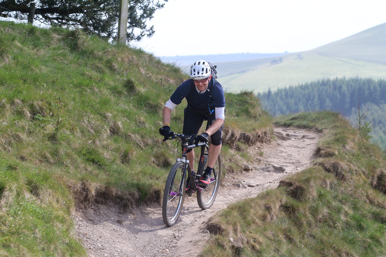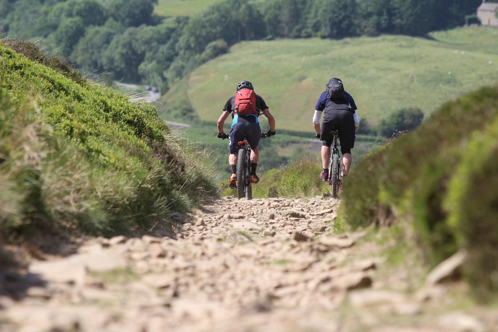 Wheel back on, the ride resumed. We were headed up the old Roman Road that would take us to Hope Cross. Dropping it into my not so low gear of 24:26, I did my best to spin up the loose and dusty climb. Nick on his fancy plus size 29er and Mark on his pun-tastic, app-controllable (yes, you read that right, a bike that you can control using your phone – my teenage brain would have been fried at the very thought!) Specialized Evo Kenevo e-MTB, unquestionably the antithesis of my machine, practically wafted up the trail while every pedal stroke for me became a battle of traction and control.