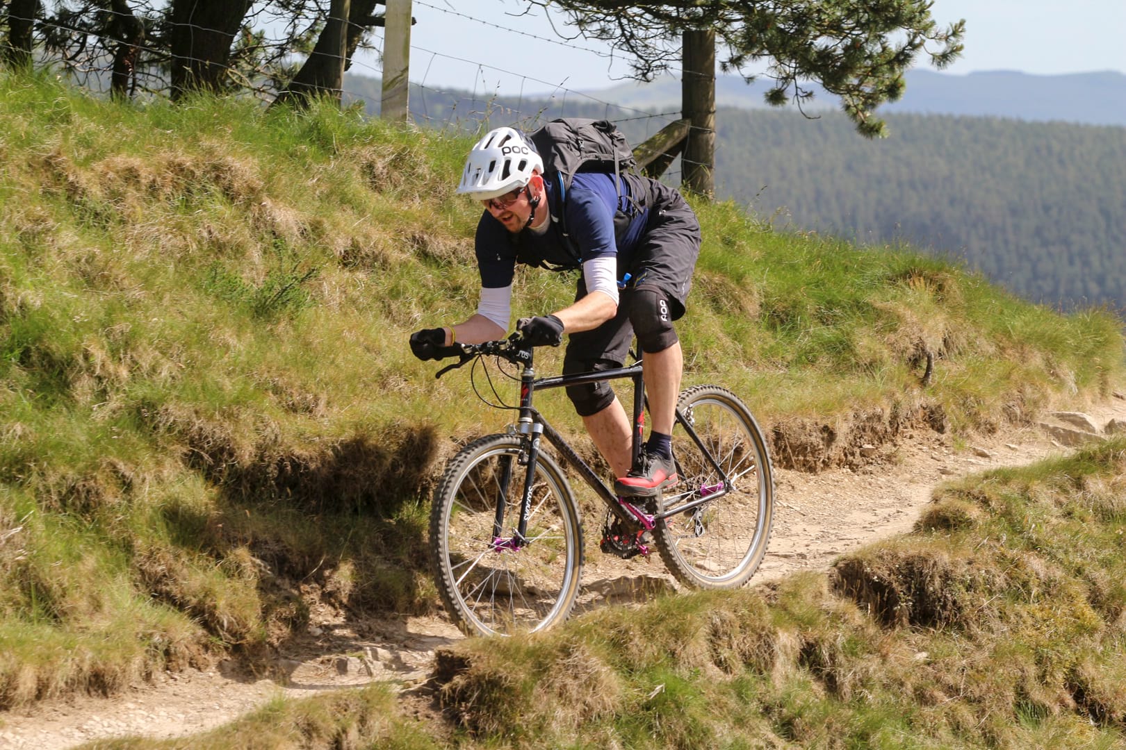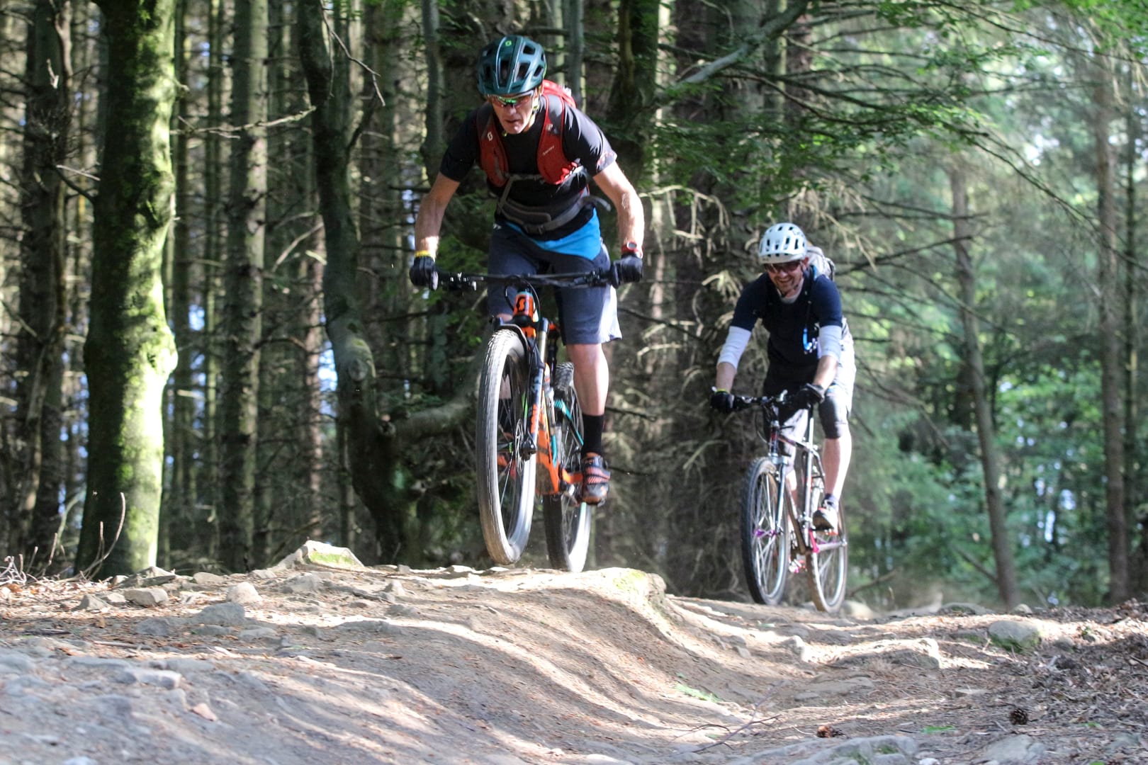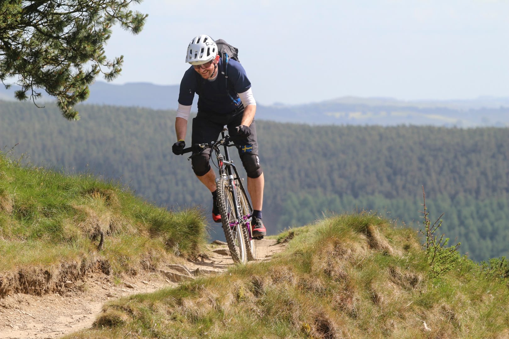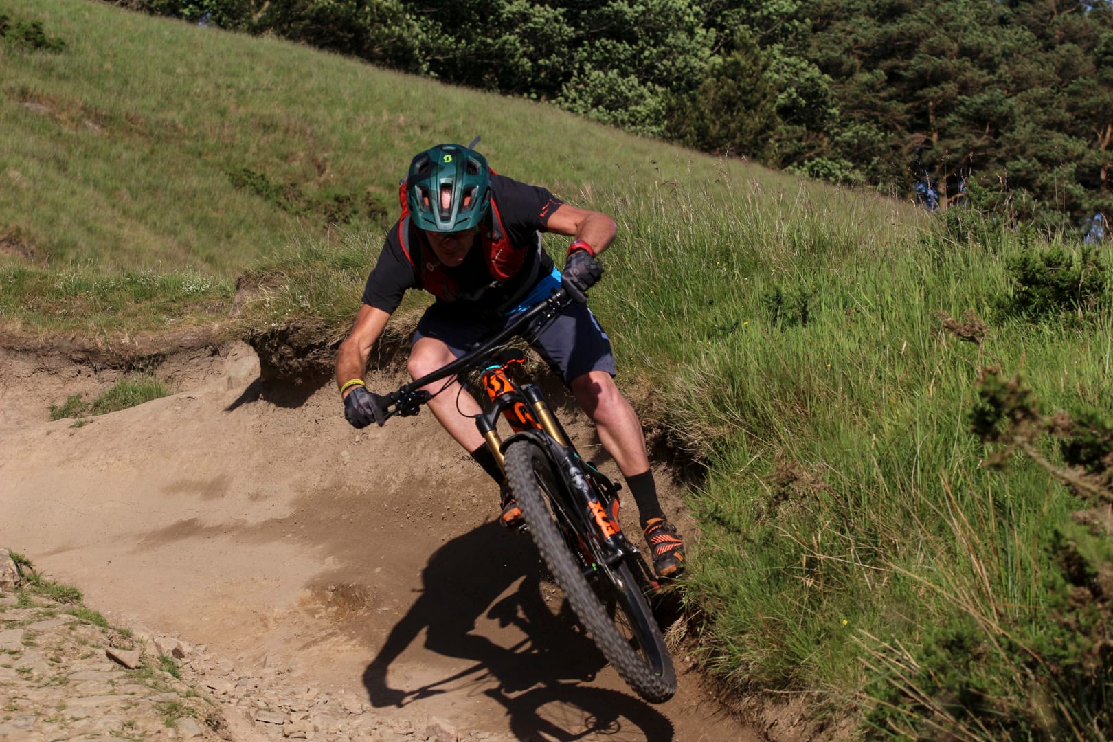 Leaving him far behind, a long road section beckoned. On modern bikes, it is easy to become bored with such interludes. All they do is help join the dots, but for me, my back and neck now less than happy, the gentle spin came as a blessed relief. I could finally enjoy the feeling of the warm sun on my face and take in the classic view of where the Dambusters prepared for their attack on the Ruhr Dam. Reaching the northerly tip of our ride, Tim’s literary voice directed us up the tree-canopied climb to Lockerbrook Farm. Looking at the trail rear up in front of me, I didn’t fancy my chances of a clean ascent, but through a bit of man grunting and extended use of my bar ends, I was determined not be beaten. With Nick shouting encouragement, clean it I did. Take that, e-bikes and 160mm 29ers! I won’t say it wasn’t a struggle but damn, it felt good when I reached the top.