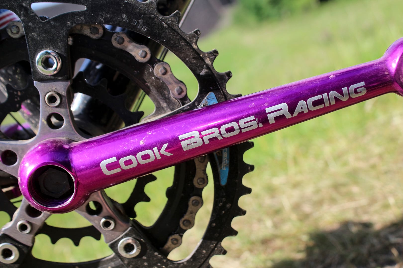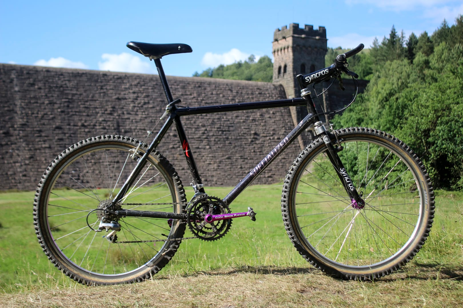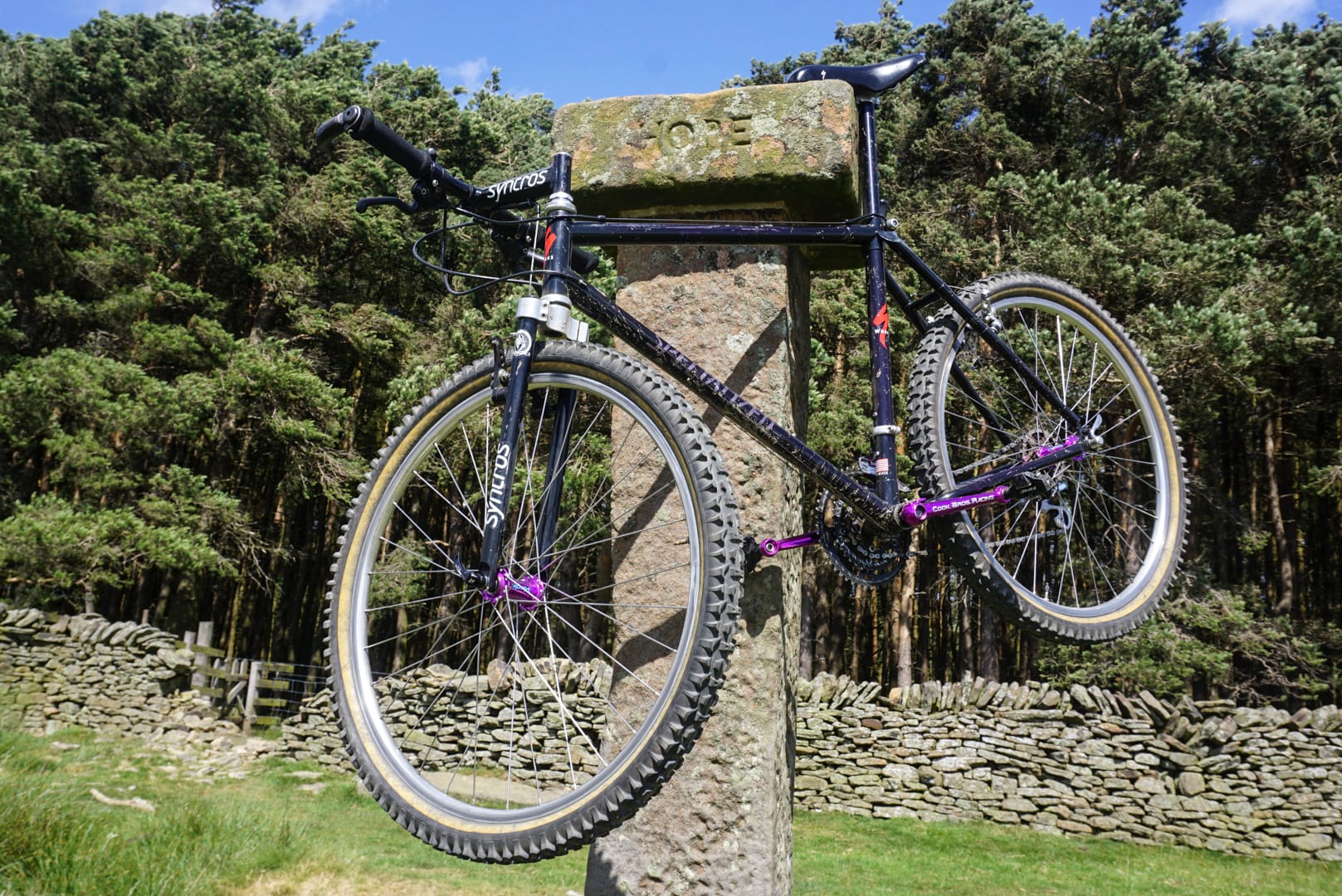 Quickly rebuilt, to my genuine astonishment and that of James in the office who bravely disregarded his own personal safety and swung a leg over it, the damn thing actually worked. You could practically taste the nostalgia as I waxed lyrical/bored the shit out of James taking him through a who’s who of retro-tastic parts. “See those brakes? Graftons. Oh yeah! And those cranks? Cook Brothers finest. Bet you’ve never seen a pair of forks like those straight blade Syncros beauties? Oh and look at the brake levers. Suntour XC Pro… mmm!” Throw in a bonded carbon frame with pearlescent purple fade, a 150mm (yes, you read that right, 150mm) stem that looks more like a tiller, purple screw-on-block Ringlé hubs and Panaracer’s mould-breaking Smoke tyres, and you have what even today is a beautiful looking bike. It is so wrong, which just makes it so right. The fire was lit. We were ready to rock.