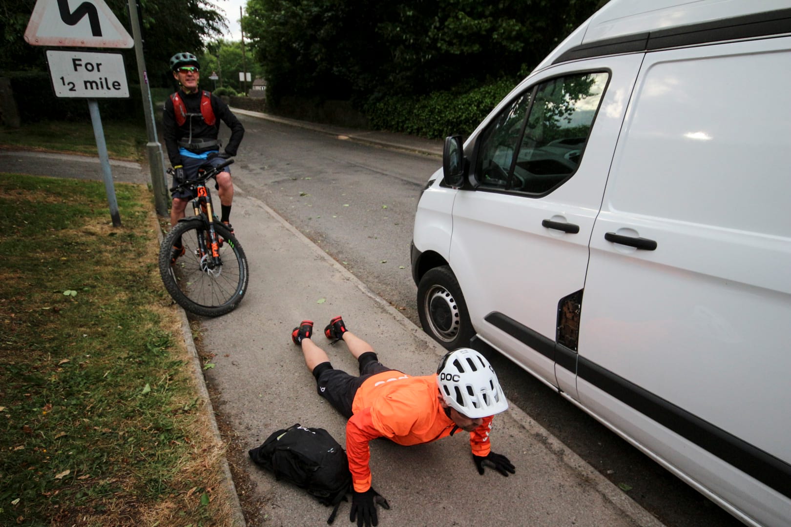 Undaunted, I encouraged them to get a wiggle on as I jauntily hopped on my bike and immediately wished that I had taken those yoga classes I had promised myself. Long and low are fine but being stretched out like you are on some medieval torturer’s rack, not so much. “Did I really ride like this?” I thought to myself while Nick and Mark were taking bets as to how far into the ride I would get. Spinning along the singletrack road in dappled sunshine, I was feeling good. Stretched but good. It took all of 50 metres for my front tyre to make a telltale ‘pfft pfft pfft’ sound. A bloody puncture! Perhaps I should have heeded Matt’s advice after all? Throwing me his pump, Nick kindly offered to help me fix my next puncture. Could it be that he expected more? Oh he of little faith.