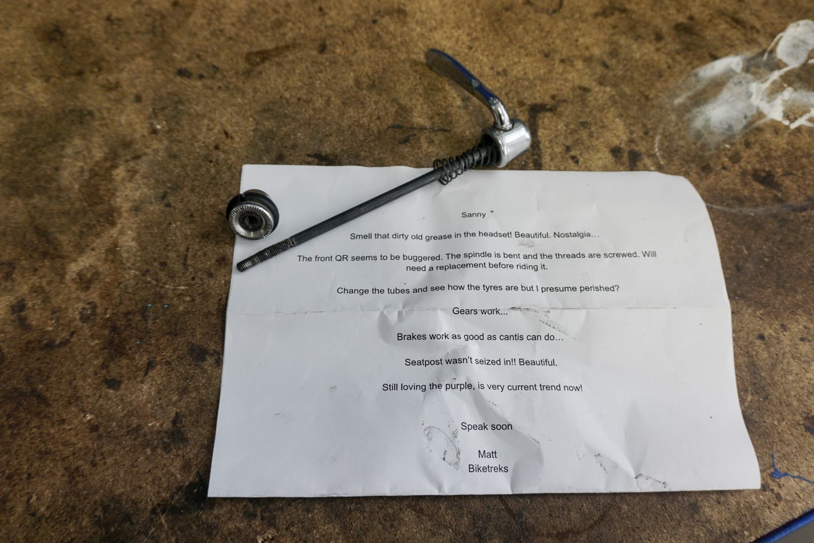 A classic ride demands a classic bike. As luck would have it, I had just the ticket. Having been on display in Biketreks in Ambleside for several years, my old S-Works Carbon Epic circa 1992 was pressed into service. Unboxing it at Singletrack Towers, a note dropped to the floor from Matt at Biketreks. Clearly a man of taste, Matt recognised the nostalgic beauty of the old grease and the bang on trend purple detailing. I like the cut of his jib! Advising me of the buggered QR spindle and the tyres and tubes being in dire need of replacement, I chose to sort the former (rather liking my teeth to still be in my head at the end of a ride), but threw caution to the wind with the tyres. After all, this was to be a retro ride. No modern rubber for me!