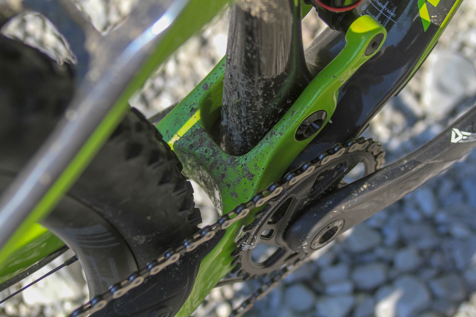 The rear brake is positioned well inboard of the chainstay. It’s tucked out of the way yes but a little trickier to access and spacing towards the rear of the chainstays runs wide as a result. This wasn’t something that interrupted pedalling style or negatively affecting feet positioning for me but worth noting if you ride very heels in.
