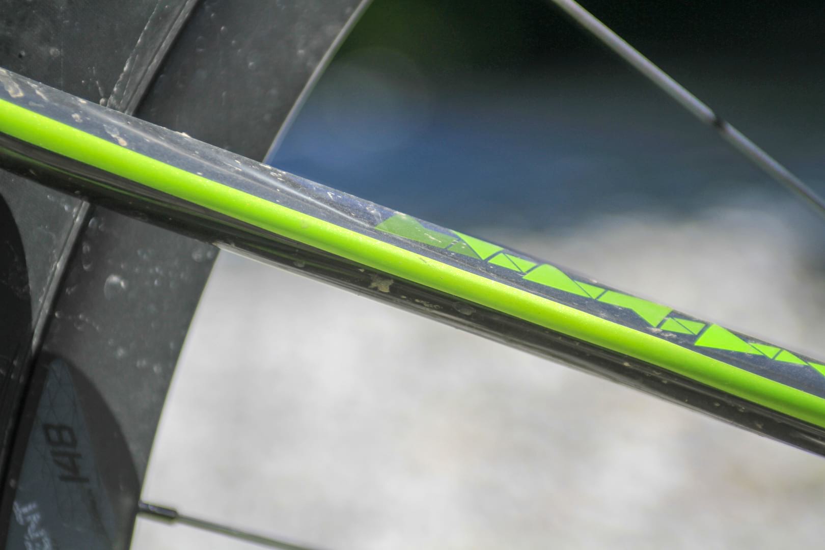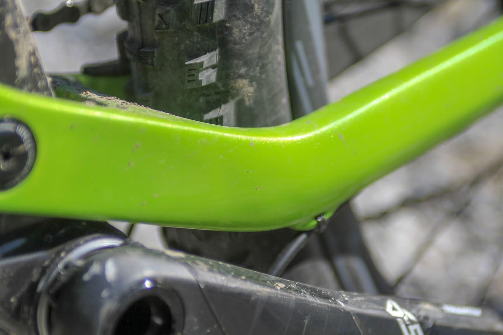 Material on the underside of the down tube comprises two materials. The outer layer is a harder compound than the inner layer. This serves dual duty – impact protection and sound dampening. In an effort to keep things quiet there’s a neat rubber chainstay protector and an additional section of rubber wrapped around the side and underside of the seat stay.
