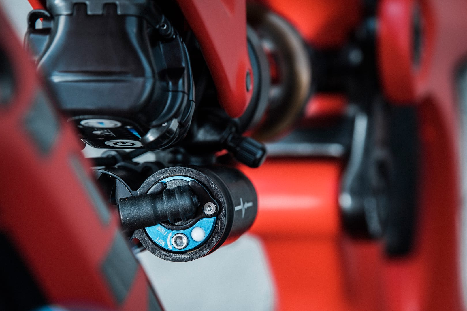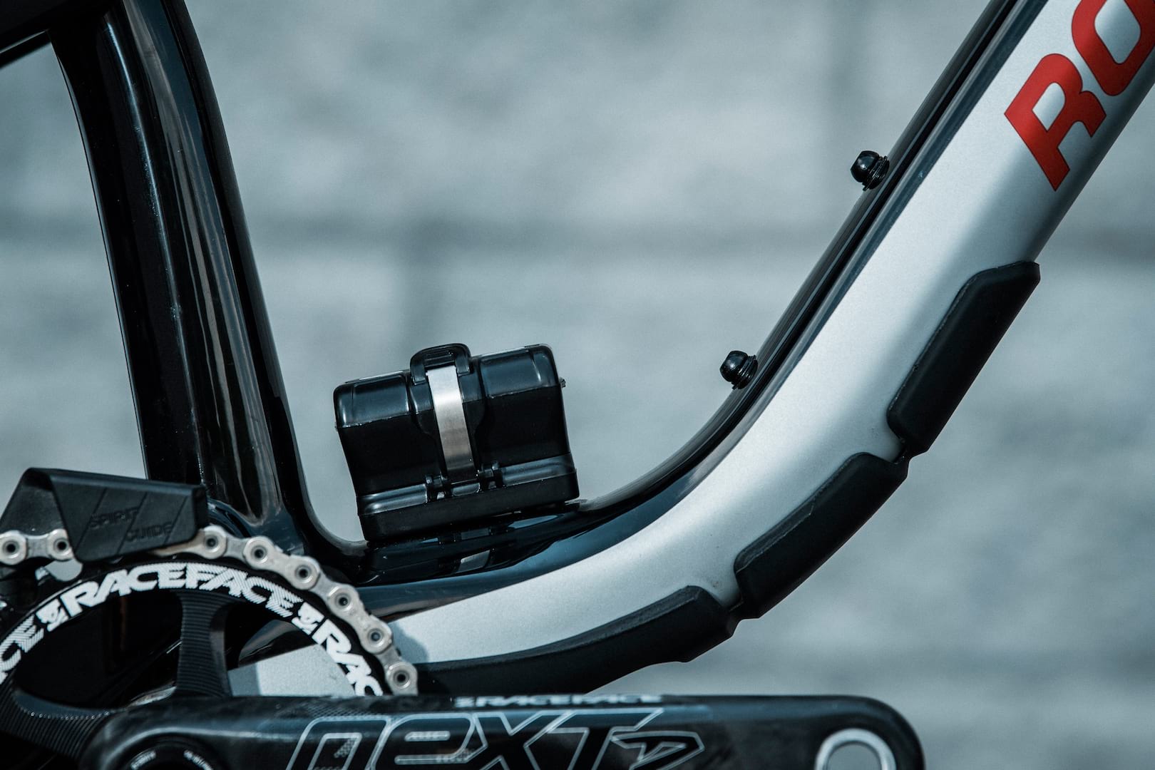 At the heart of the system is the battery and brain of the Live Valve system. This is the head unit, housing the on/off switch and the sensitivity setting. This unit is securely fitted – either to just below the bottle cage, or near the piggyback of the shock. It’s easy to remove if needed, though it can be charged in situ too. From here, wires go to the rear shock, to the top cap of the fork, the sensor on the fork brace and to the sensor next to the rear axle.