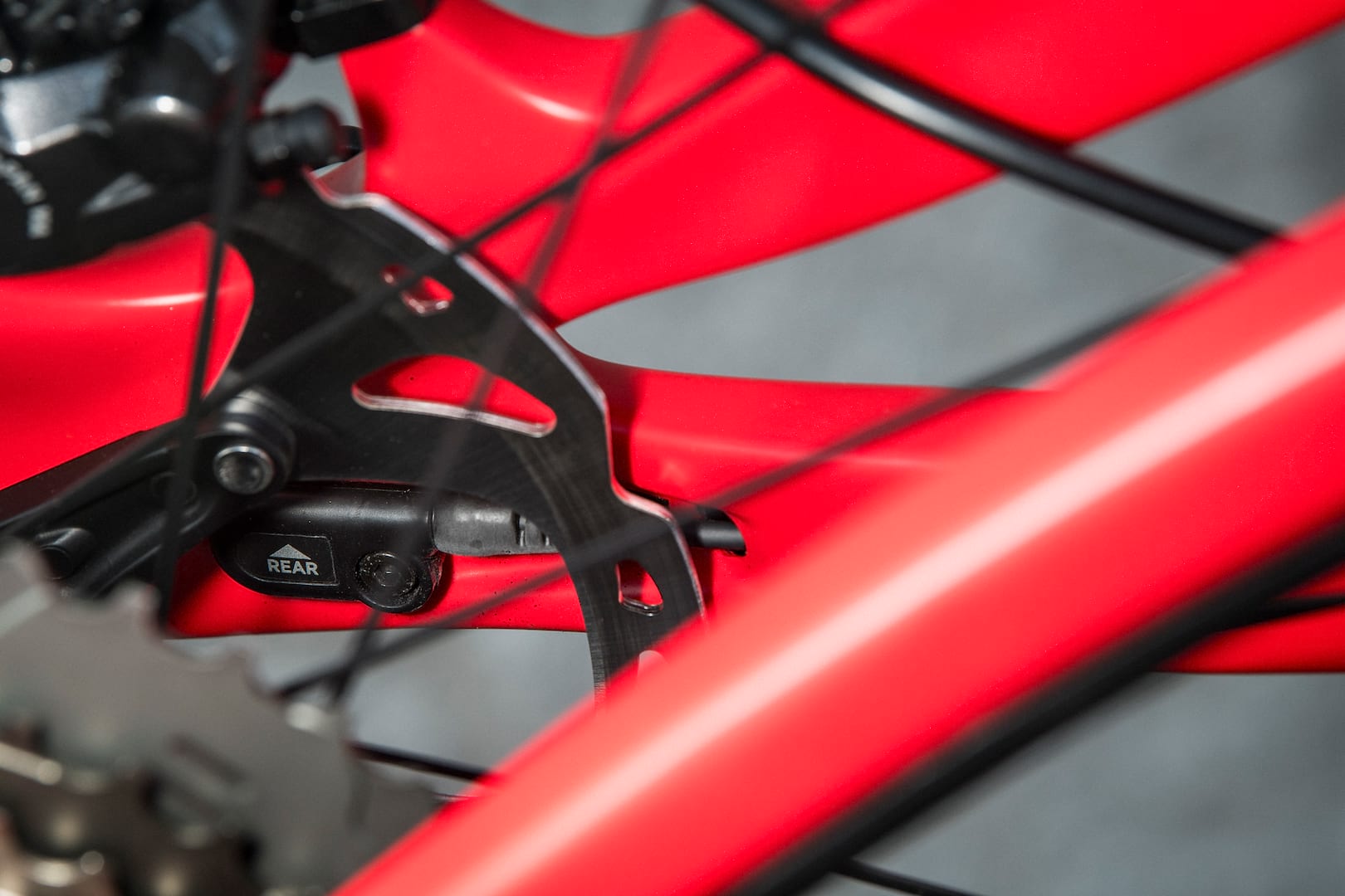 The system has three sensors – in the fork, head unit and rear axle. The rear sensor controls the rear shock (the fork sensor does fork and rear shock) so if you wheelie over a bump, it’ll feel it and open the system.
