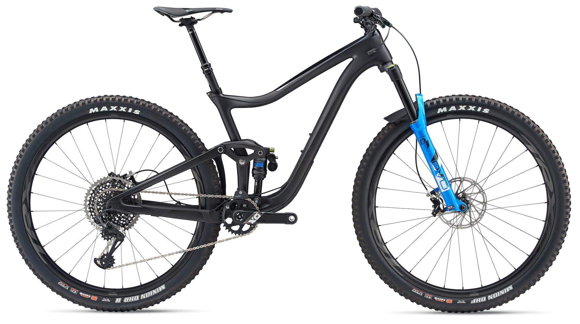 The flagship Trance 29 gets a superlight carbon frame with a two-tone Metallic Carbon/Gloss Carbon finish and is the bike you want if you want to emulate the Giant Factory Team with its custom blue DVO Suspension front and rear.