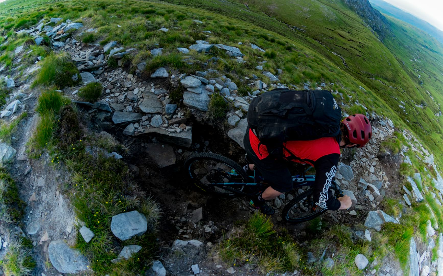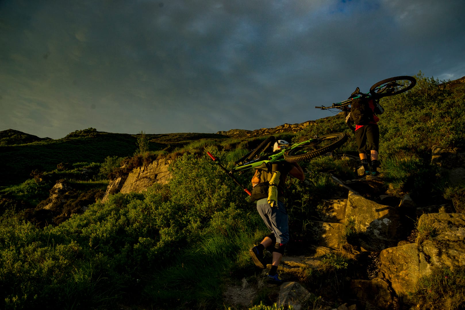 By now, keeping together seems less important and Ali leads the charge – his combination of trials and trail skills seem to get him down pretty much everything that’s in front of him. We’re left to navigate the hill as best we can. With our brains slowed by lack of sleep and struggling to process the trail ahead with any real prowess, we bumble our way down as Ali’s yellow jacket vanishes further and further into the distance.