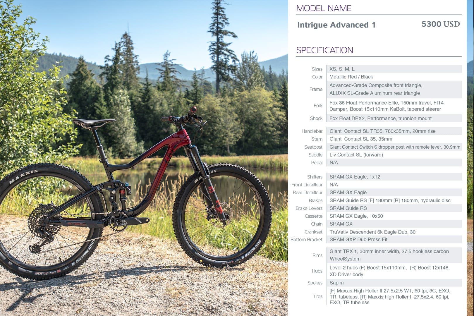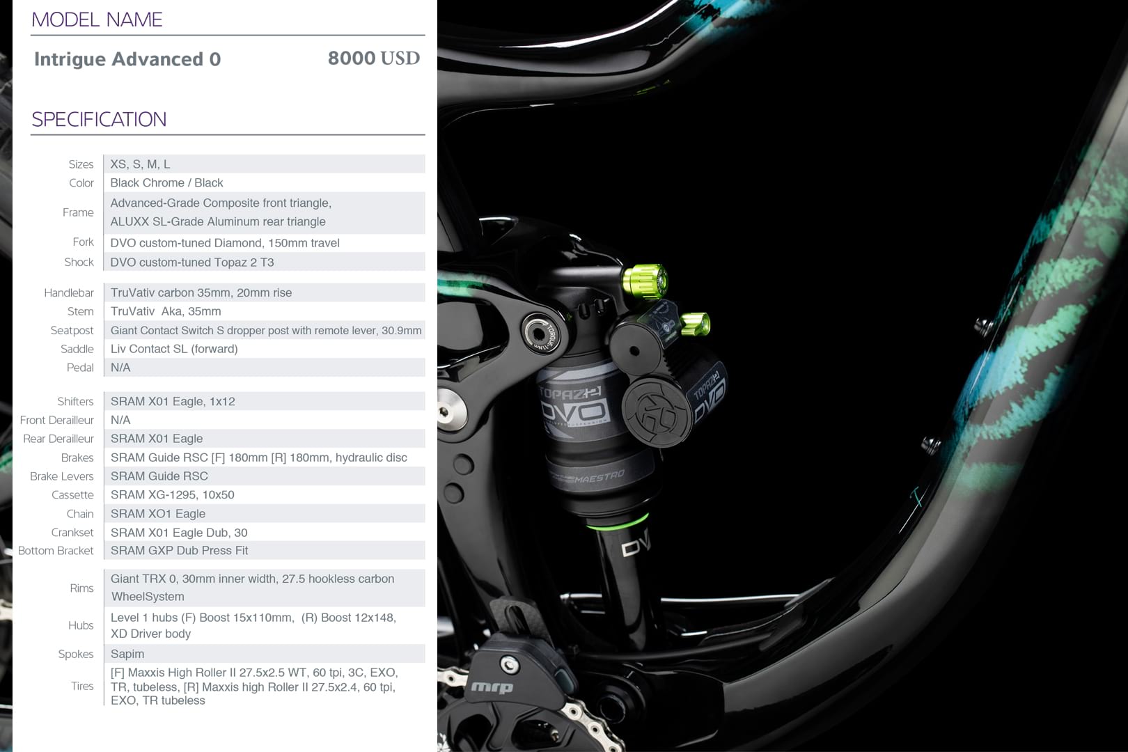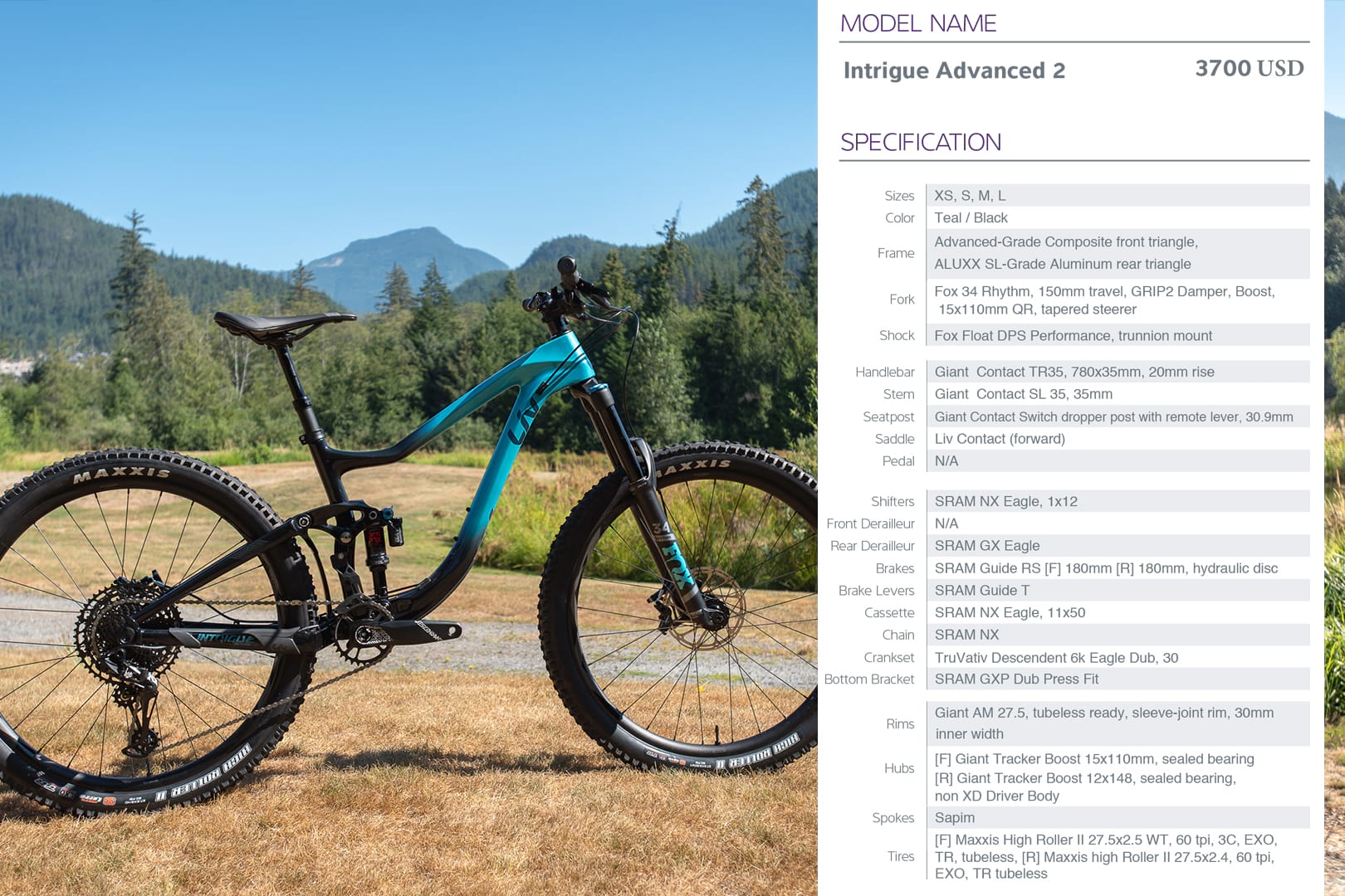 The range features three models, all of which are hand-crafted with advanced-grade composite. The head angle has been updated from the 2016 model, previously 68.0 now at 66.5 degrees. The new Intrigue also has a steeper seat tube angle of 74.5 degrees. The bikes all come with a 27.5in Giant TRX 0 Boost wheelset with tubeless Maxxis High Roller II, 2.4in front and 2.5in rear but compatible up to 2.6in.