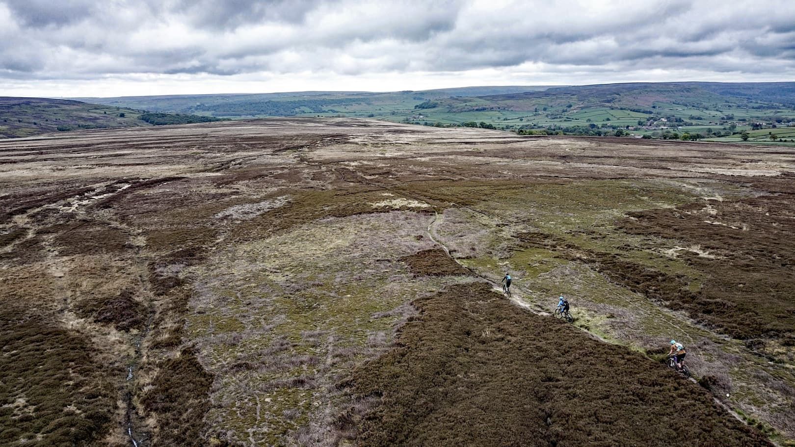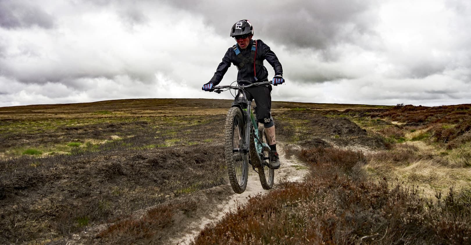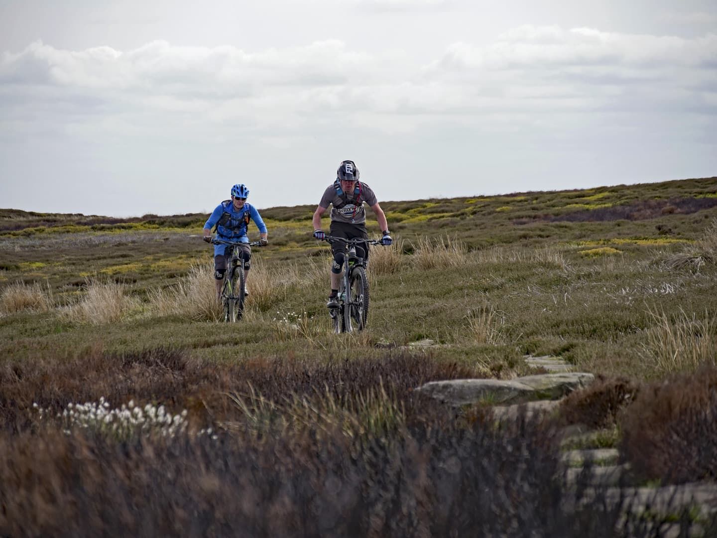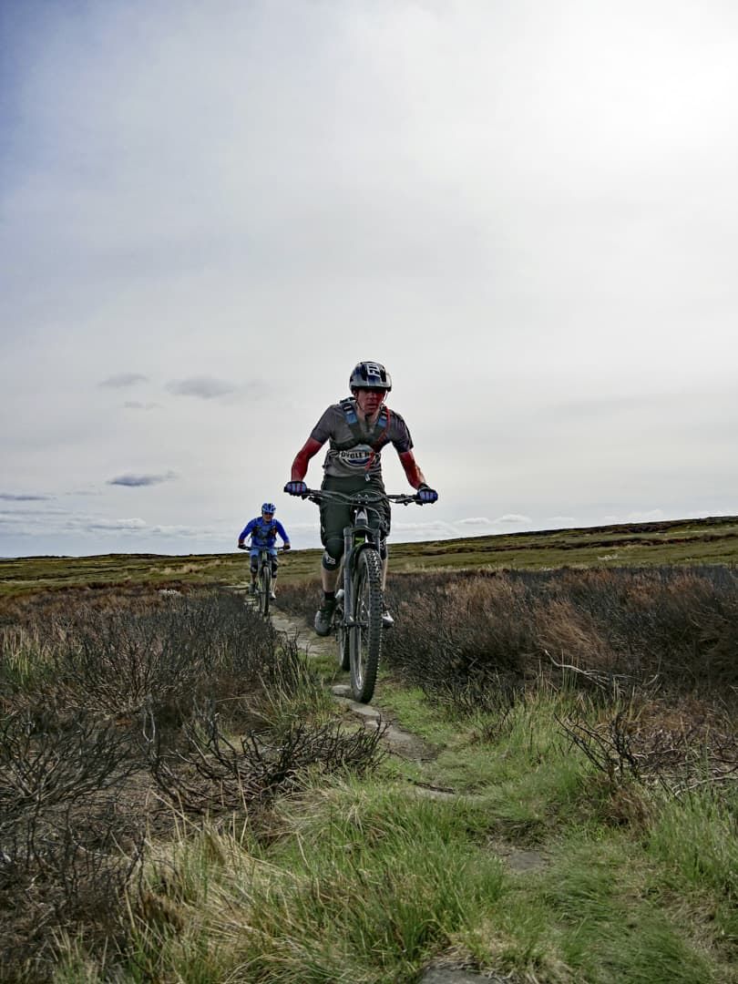 As we climbed higher, the trail changed from steep grass to steep bracken singletrack, with some boggy sections lined at one point by large sandstone boulders. Phil called them the Shivering Stones, although he wasn’t 100% sure why they got their name. Luckily the gradient eventually eased and we were rewarded with a fantastic section of singletrack cutting through the heather and incredible views all around. As we reached a small singletrack road, we decided that the climbing pain had been worthwhile for the mega view.