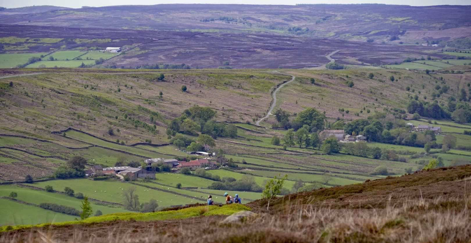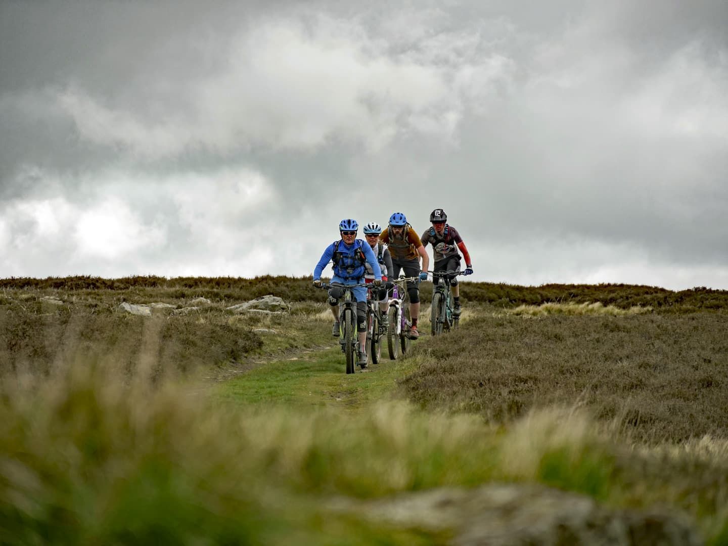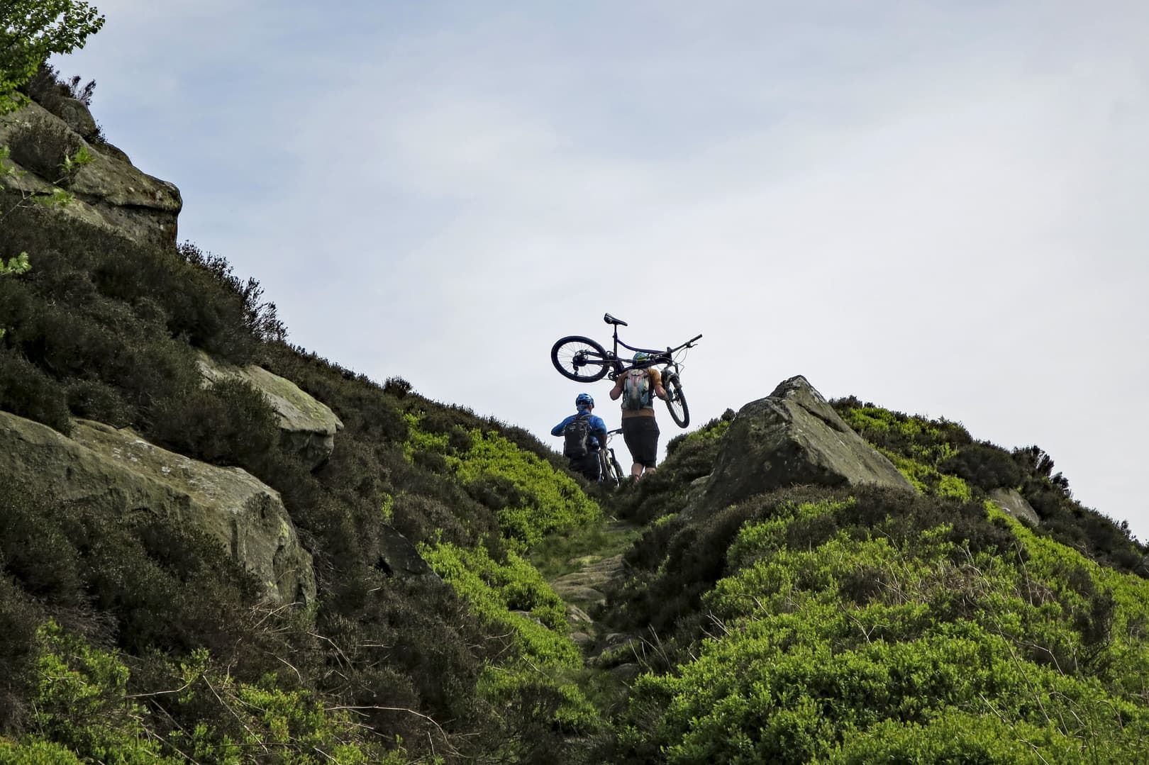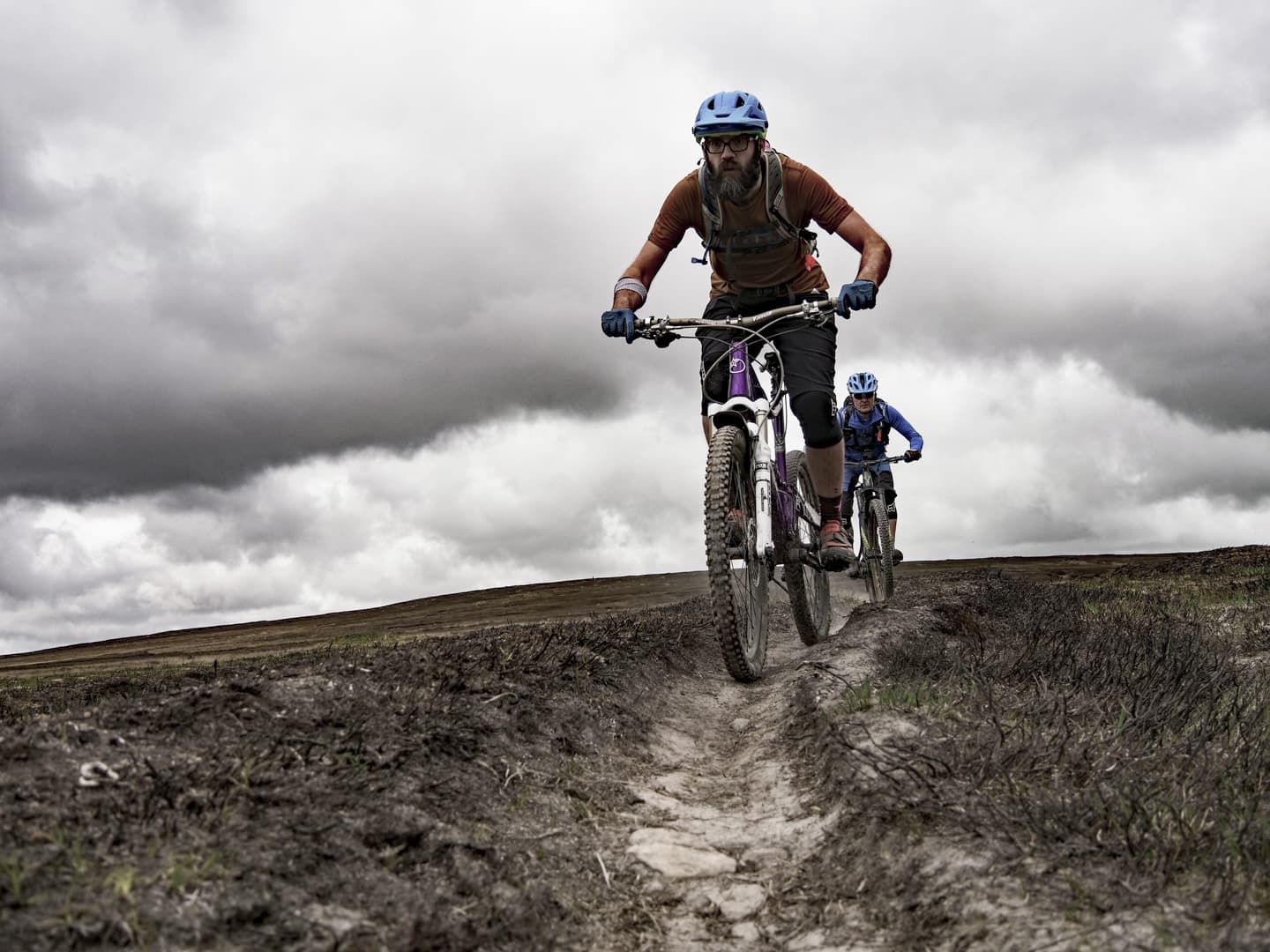 As we climbed higher, the trail changed from steep grass to steep bracken singletrack, with some boggy sections lined at one point by large sandstone boulders. Phil called them the Shivering Stones, although he wasn’t 100% sure why they got their name. Luckily the gradient eventually eased and we were rewarded with a fantastic section of singletrack cutting through the heather and incredible views all around. As we reached a small singletrack road, we decided that the climbing pain had been worthwhile for the mega view.