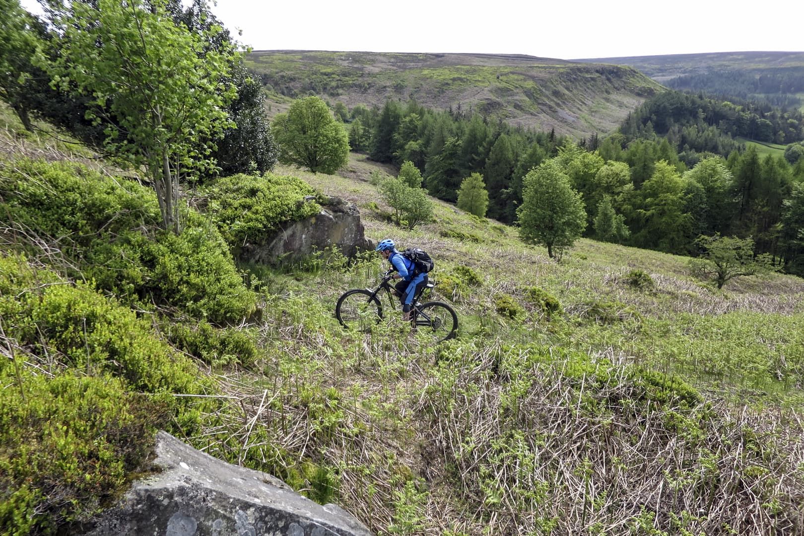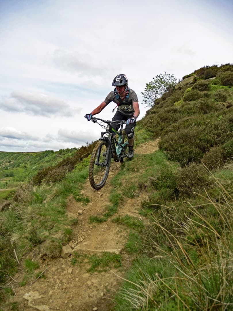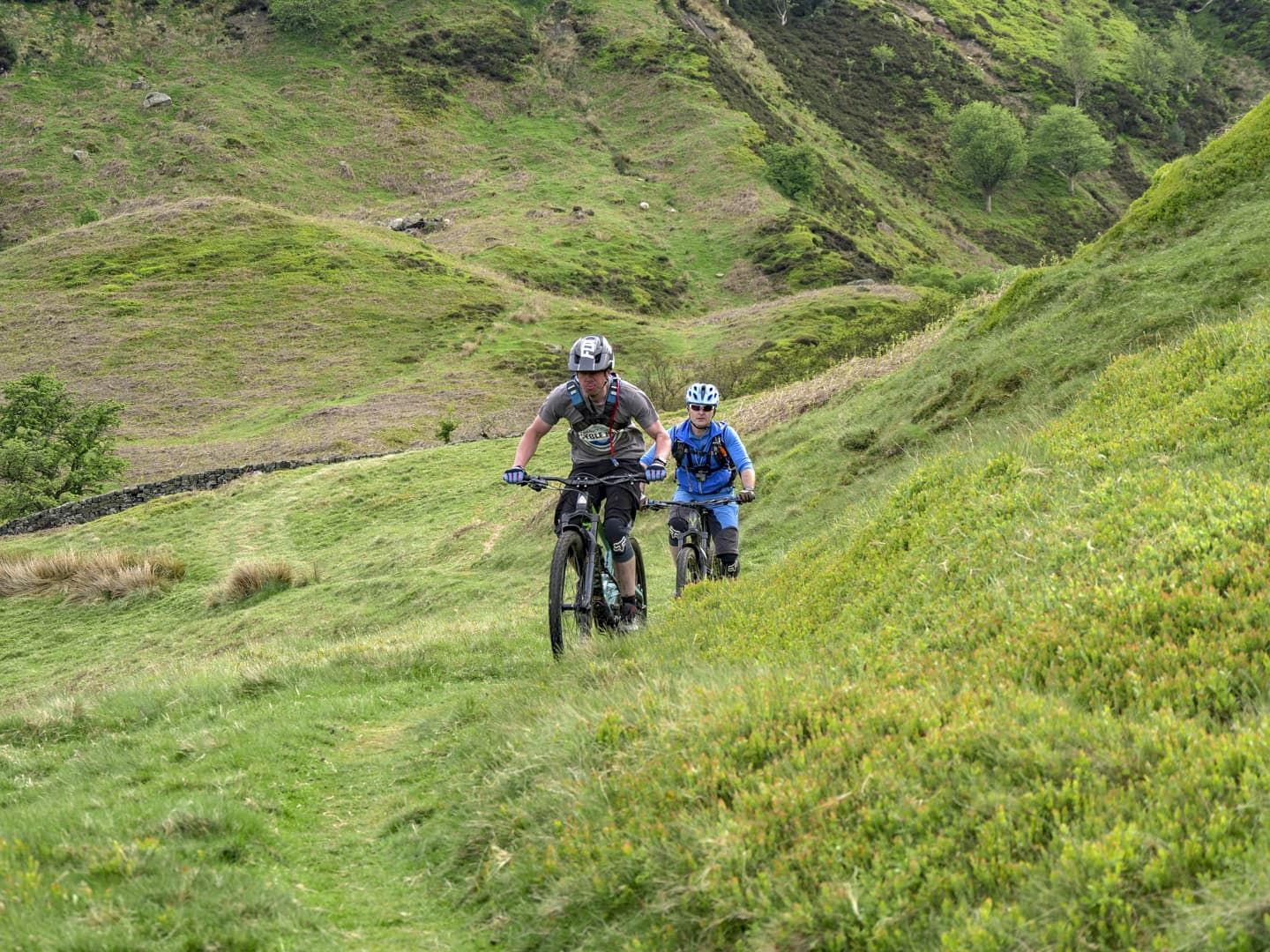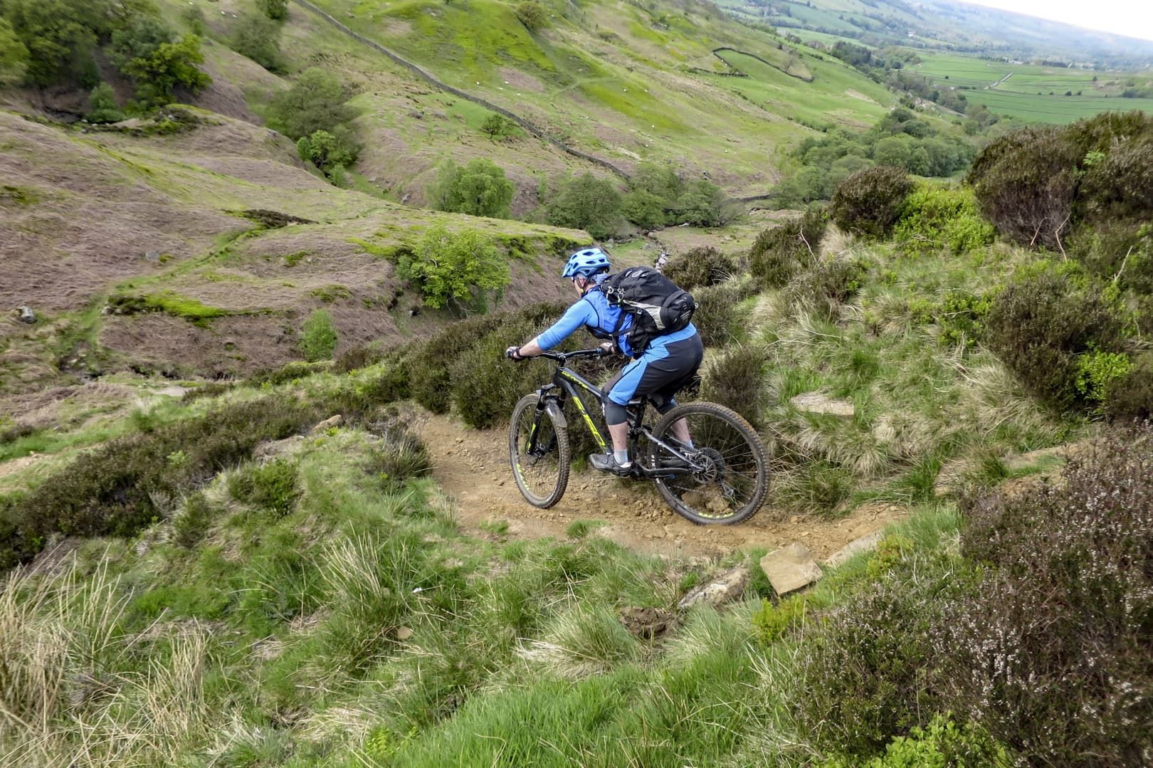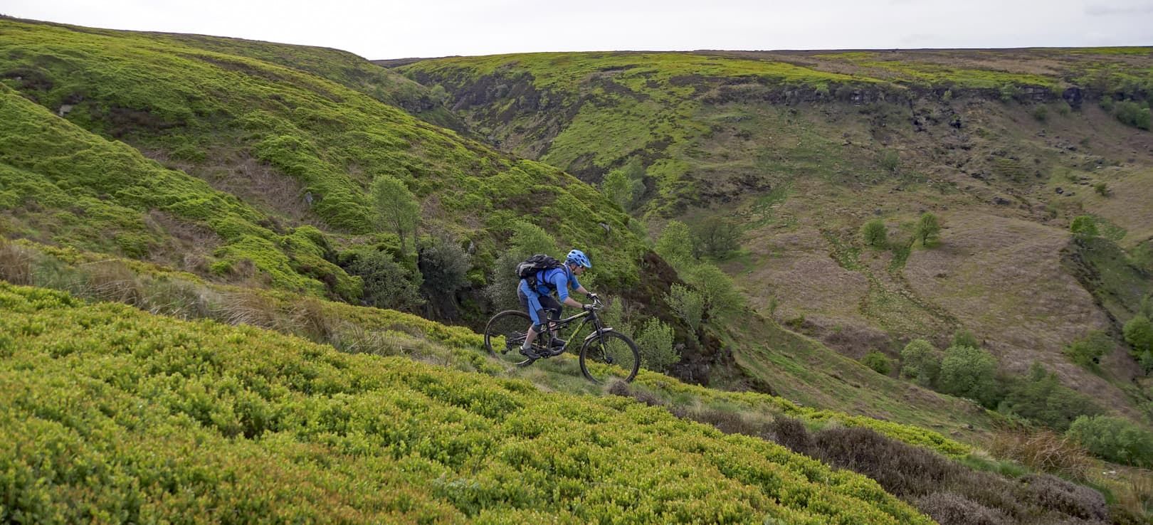 The view in front of us was stunning. Late afternoon sunshine was lighting up the wide glaciated valley, a vaguely discernible singletrack running down the left-hand side, weaving in and out of small interlocking spurs. It was like looking into a photograph in a dusty physical geography textbook. But although the view was textbook, actually riding the trail would prove to be somewhat more off-piste. I’ve known Mike for around a decade and he’s one of the most competent and bombproof riders I’ve ever met. He’s a professional mountain bike skills instructor and pays his mortgage by teaching people how to conquer their demons and ride smoothly and safely down trails that initially scare the hell out of them. So, for Mike to be nervous about riding a route was a new experience for me. With no prior knowledge of the trail, I was relying on Mike and Phil, local resident and co-owner of the nearby Yorkshire Cycle Hub, to give me a heads-up as to what I was about to let myself in for.