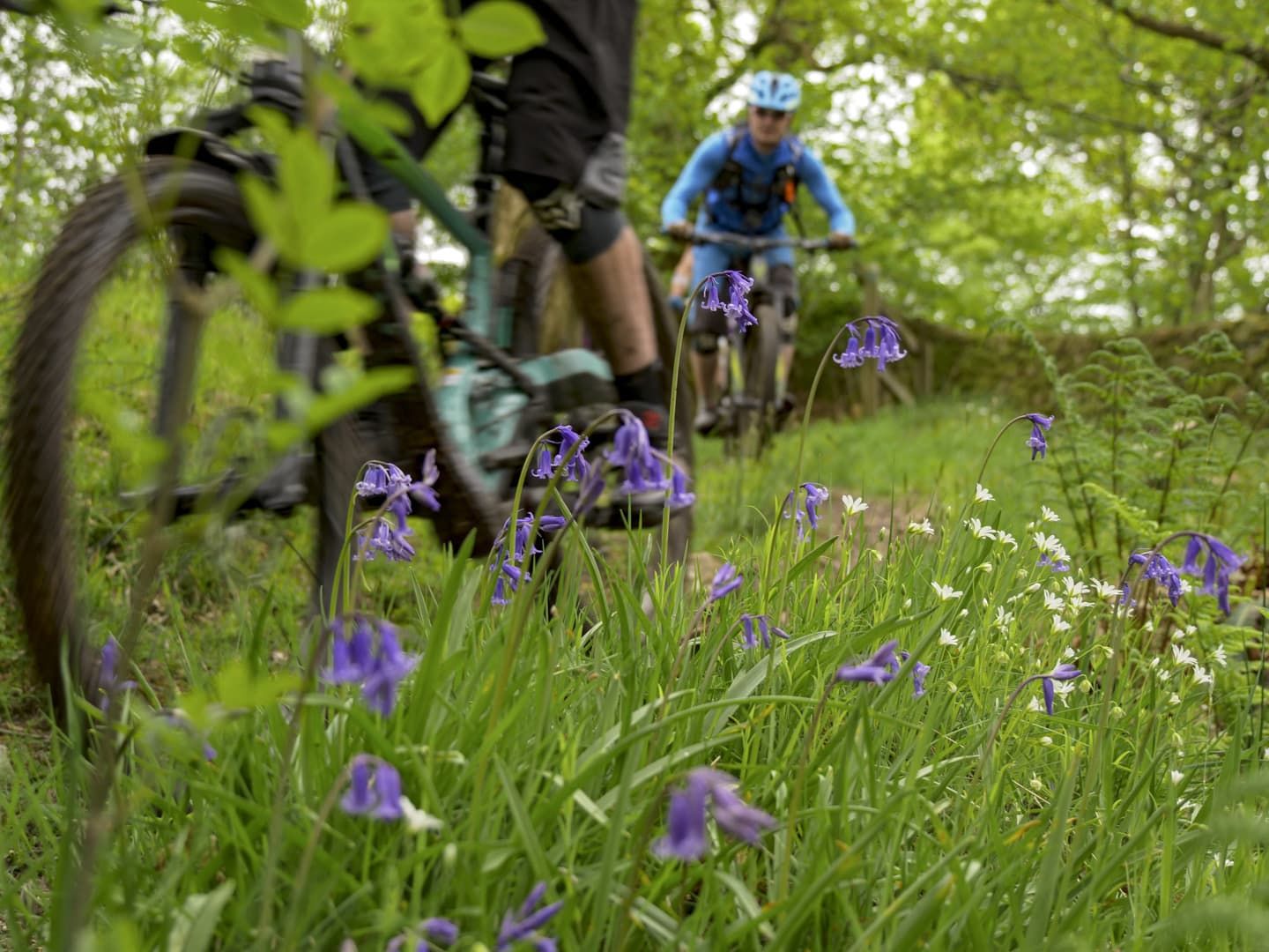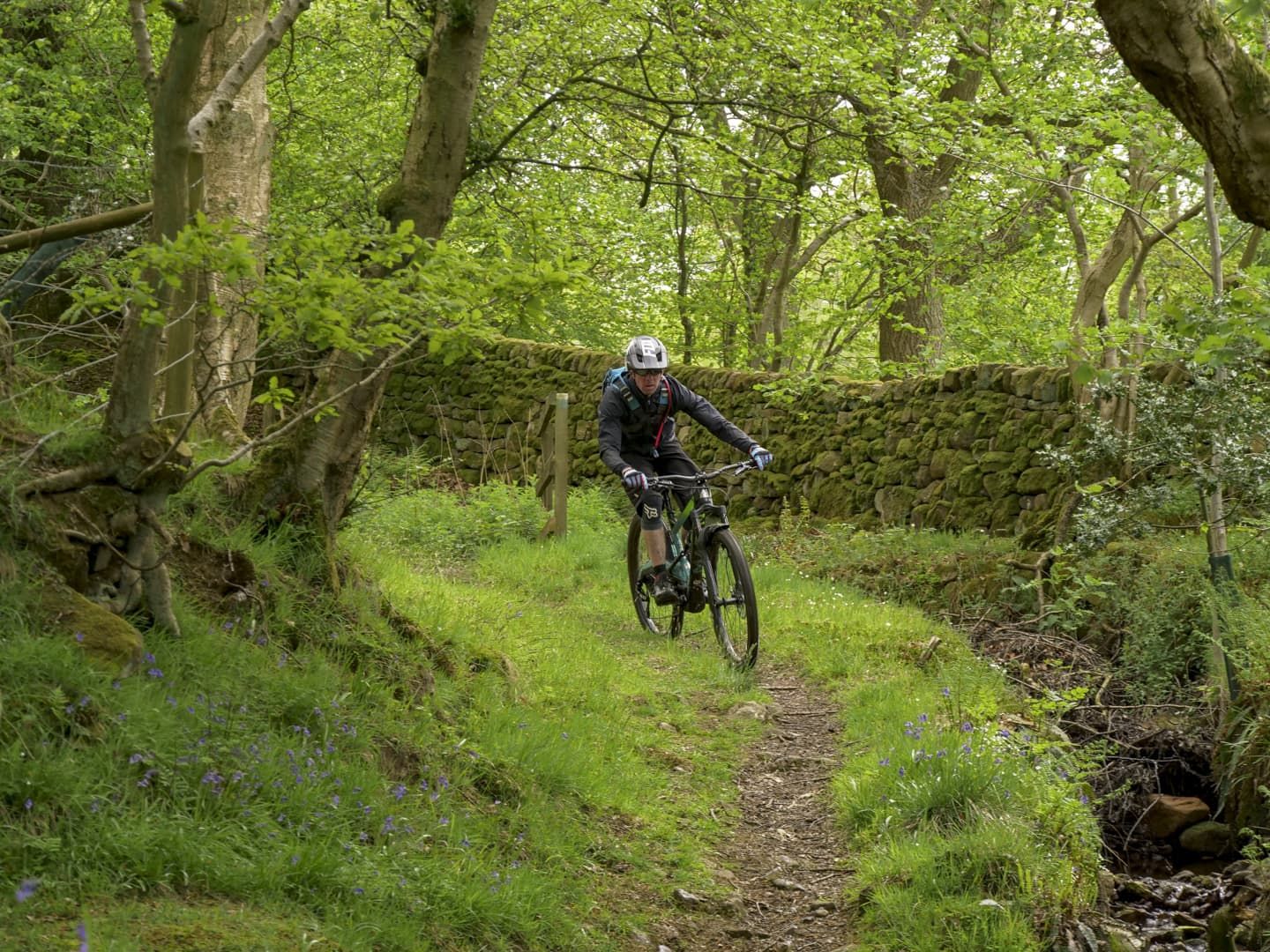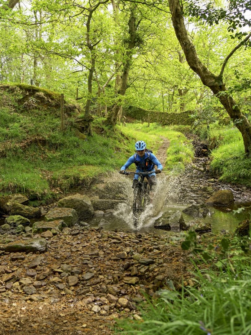 After a short, fast moorland section, we followed Phil’s instructions and headed steeply down through what appeared to be someone’s garden, and into a wooded glade. At the bottom of the glade was a perfect water splash – super-scenic, with dappled sunshine making an appearance, a smattering of bluebells, and water just deep enough to make a satisfying splash. We stopped and played for a bit while Neil repaired a perfectly timed puncture. A short climb through the trees leads to a section of trail that appears to be man-made – wide enough to ride side by side, hard packed and flowing, it induced some elbows-out riding. We were soon back on more technical trails though, with a short, sharp drop down a set of bedrock steps next to a drystone wall. All 100% legal, said Phil as he saw the slight look of concern on my face. A quick check of the map confirmed this – totally legit technical singletrack – hurrah for Yorkshire! At this point my stomach made an involuntary rumble, which Neil obviously heard. “How would a café stop at the top of the next climb sound?” he asked. Perfect.