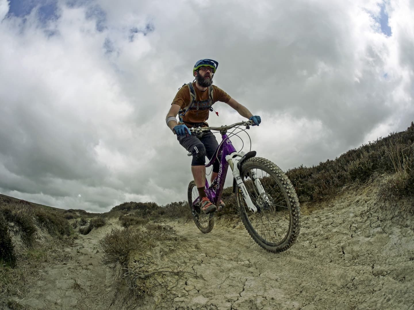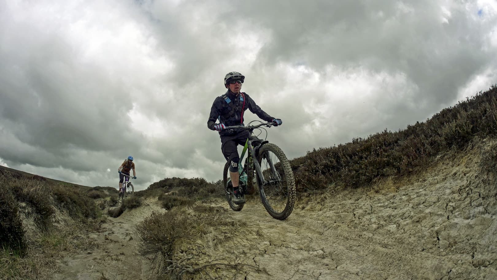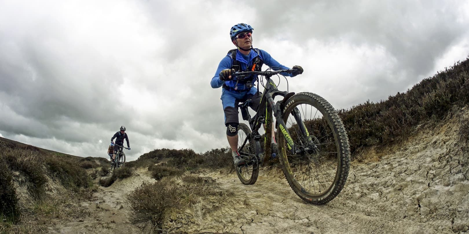 At the top, our first taste of moorland riding lay in wait. Fast, super-flowy and with actual dust waiting to be kicked into the air, we gave it some beans and enjoyed the feeling of dry, springy trail under wheel. This trail cuts its way through the heather – perhaps one to come back for in late summer when it’s in bloom – and with a choice of lines in places it was perfect. Neil led and was flying. In fact, he was actually flying at one point. Even from a relatively distant viewpoint (I blame my lack of local knowledge) it was obvious that Neil’s front wheel had dropped neatly into a perfectly shaped hole-cum-parking-spot and he’d been rudely ejected straight over the handlebars. “I never crash,” was his slightly rueful comment when we arrived on the scene.