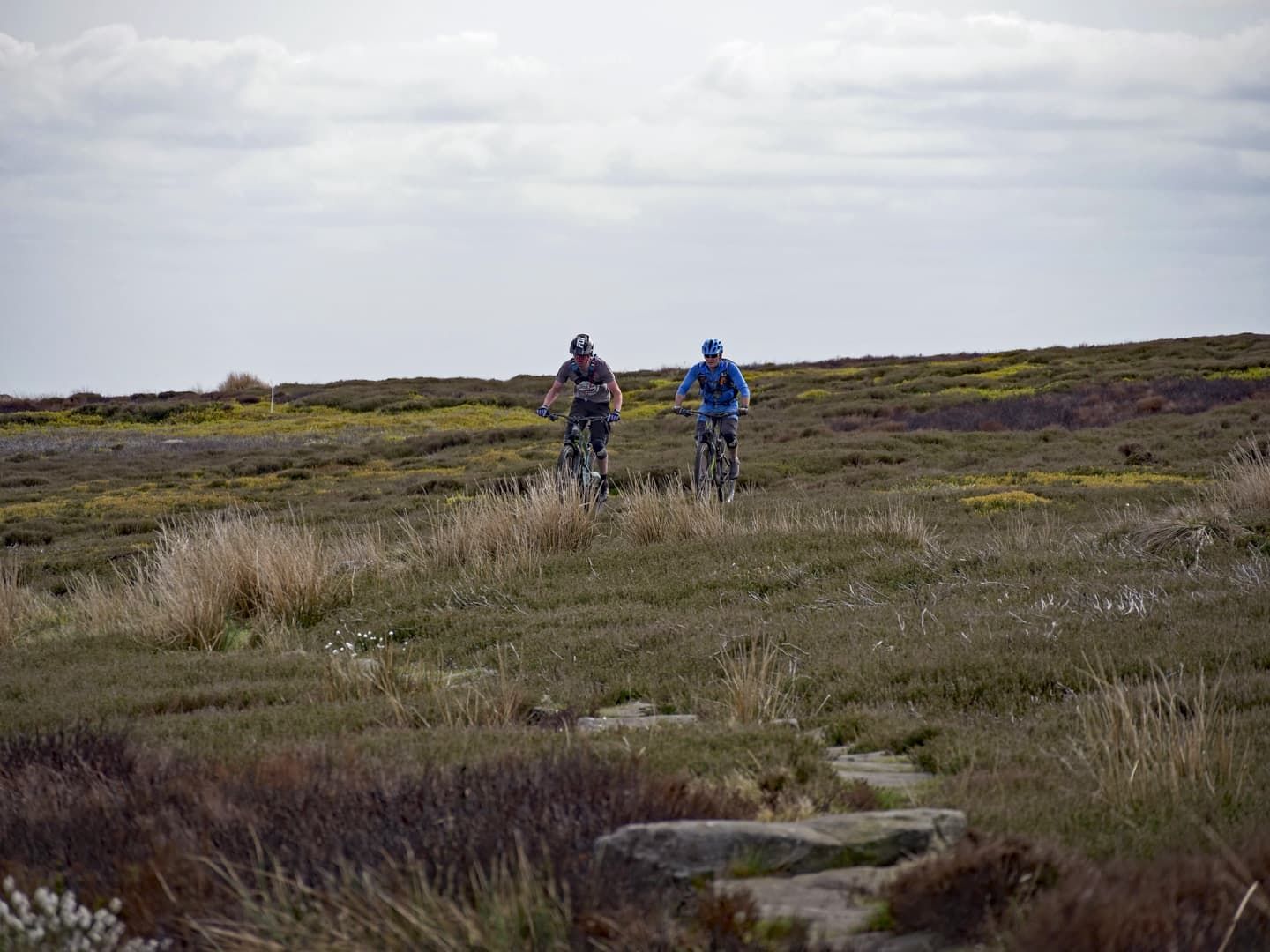 This gently rolling warm-up led to our first challenge – a long straight climb between two drystone walls, heading inexorably upwards towards the moors. The gradient is tolerable (although unpleasant on relatively cold legs), and the trail is spiced up by a liberal sprinkling of bedrock and some loose pieces of Yorkshire’s finest sandstone. Bright yellow gorse lines the trail in parts and concentrates the mind on picking a decent line up the middle.
