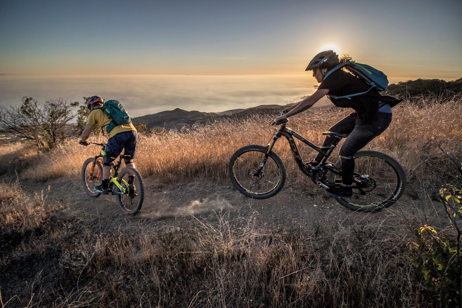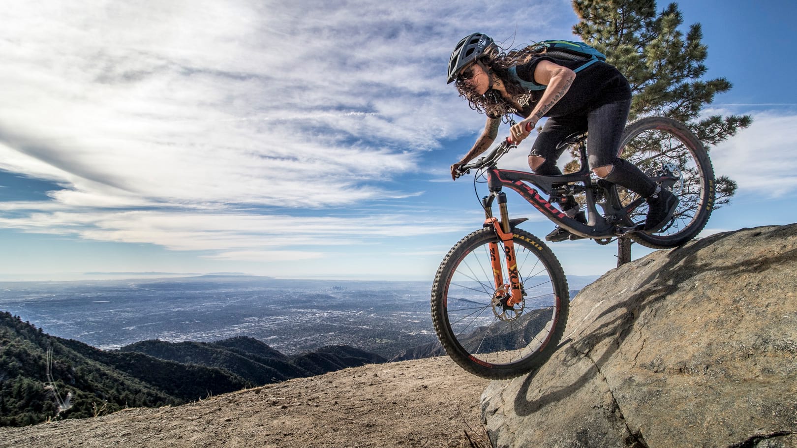 Missy was riding one of my old Sensor bikes and I was sporting a GT Force, while Timmy rode his enduro all-mountain bike. We had some good laughs, with Missy and Timmy and me taking turns to goof off and mess around for the cameras. It was a long day in the mountains and a proper day on mountain bikes. The last trail was a descent along a knife-edge ridge with the dark blue ocean getting closer with every turn. I don’t think there’s a better way to see the different parts of LA.