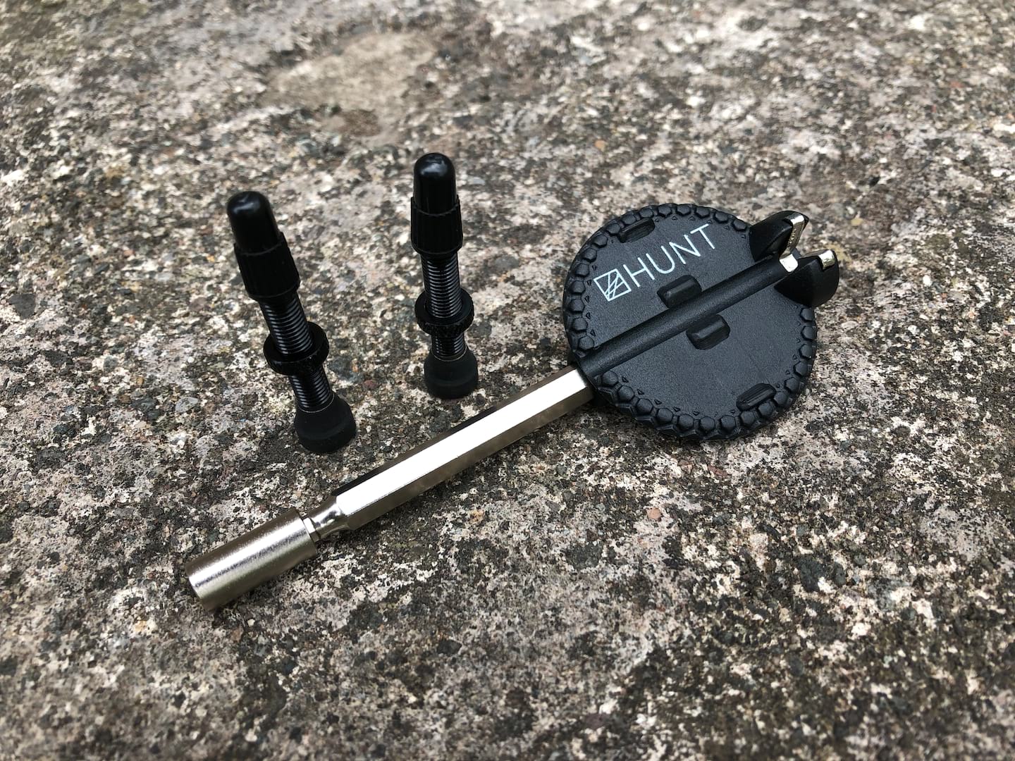 Tubeless valves, because nobody uses tubes these days., plus a handy internal/external spoke key, with both a driver head and a spoke key.