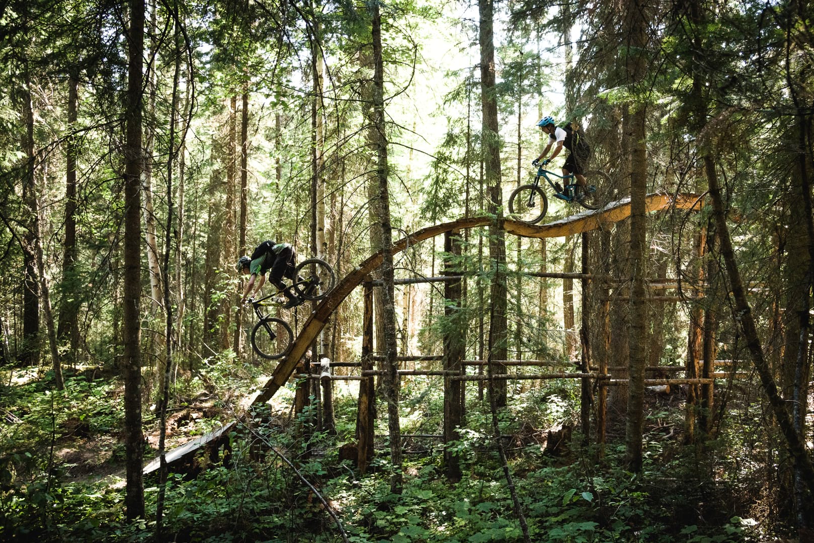 The Pidherny trails stepped things up a notch with steeper and looser favourites. The Kitchen Sink – as the name implies – has a little bit of everything for everyone on it. This all-mountain trail put everyone to the test with everything from berms to jumps and from log rides and skinnies to ladder bridges. One of its many unique and well-crafted woodwork features was the 16-foot high, hand-built roller that gave some of us more than a second thought before riding it. “Prince George had quintessential local trails,” reckoned Adam. “No huge hills, just a river valley providing enough relief for the locals to carve out the kind of trails that get you excited to go on a road trip.”