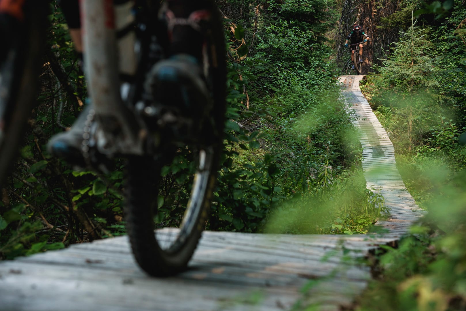 Originally founded at the turn of the century as a divisional point on the Grand Trunk Pacific Railway, Smithers has become a thriving mecca for outdoor recreation, mountain culture, and community. As we headed out from our base camp along the Bulkley River on the unceded territory of the Wet’suwet’en Nation, to ride the Bluff Trails, a moose and her calf ran right through our group – does it get more Canadian than that? We rode The Long Way up to the top, which offered up some technical sections and made it an engaging climb. Along the way we stumbled on the Wheel of Fortune; hung up in a tree, the contraption has a string to engage the spinning wheel (yes, just like the game show) and it tells you which trail to ride. Given that ours landed on one that required much, much, more climbing, we went against fate and dropped into the popular Anti Flo. We were rewarded for the steep and technical switchbacks up top and mid-section looseness with the fast and flowy machine-built jumps and berms at the bottom. There’s nothing better than a trail that has you questioning your abilities, but still leaves you feeling like a rock star at the end!