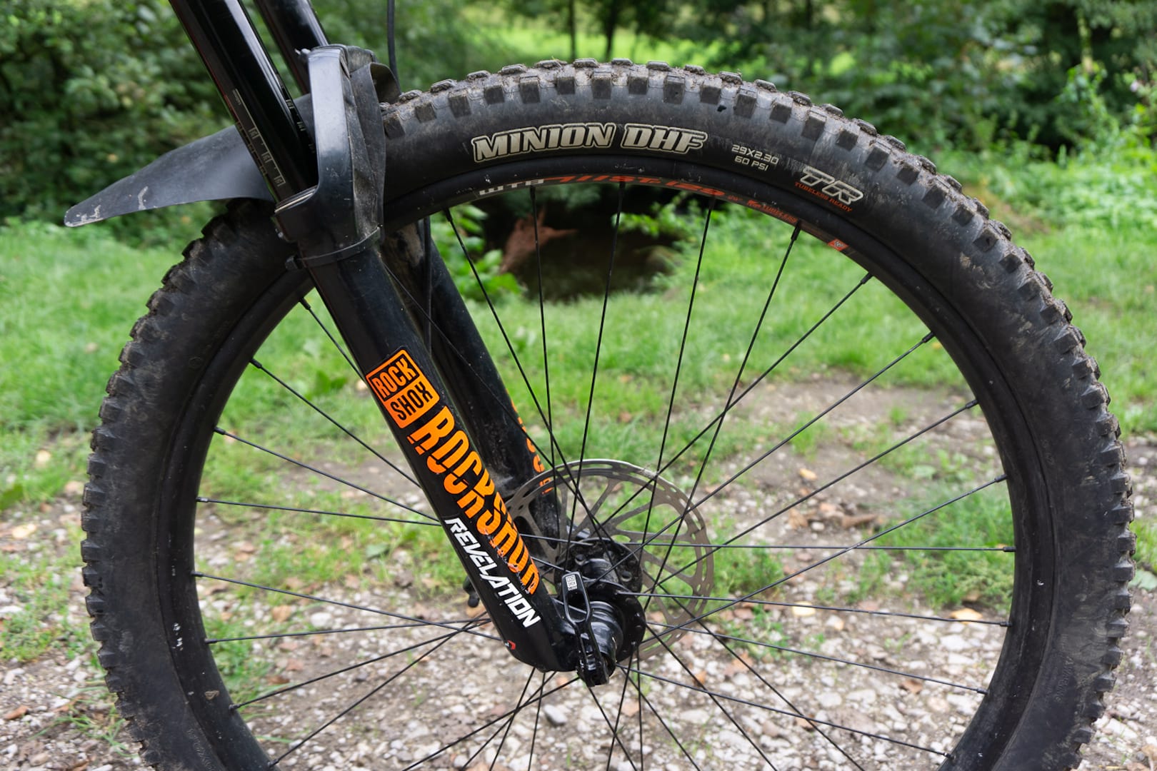 The 35mm stanchion Revelation fork is a huge improvement on its 32mm predecessors. However it also feels a bit oversprung, and certainly not as plush as the Yari forks I’ve spent time behind, even though it’s clearly cut from the same cloth. I ended up running them with three Bottomless Tokens at around 45 psi, which is a bit lower than recommended, and clicking the compression damping round a couple of notches to add support, which seemed to get them behaving nicely. The fork’s standard 51mm offset also doesn’t help on really steep stuff, and I had a couple of moments when it felt like the front was trying to tuck under. It also comes with the old style Maxle, which had a tendency to fail at the thin aluminium collar. But even with these niggles, having a burly unit up front really extends the range of what you can confidently ride. The wide rims plump up the tyres to deliver tonnes of grip, and the bike as a whole feels ready to take on anything.
