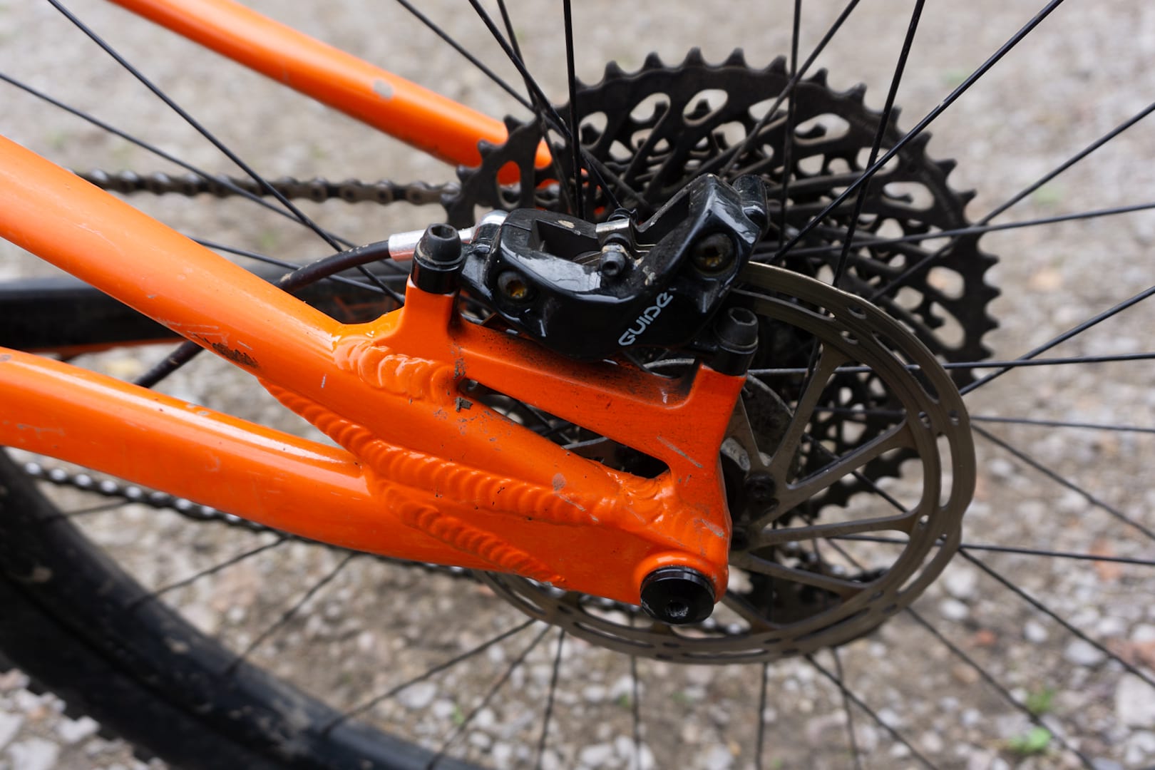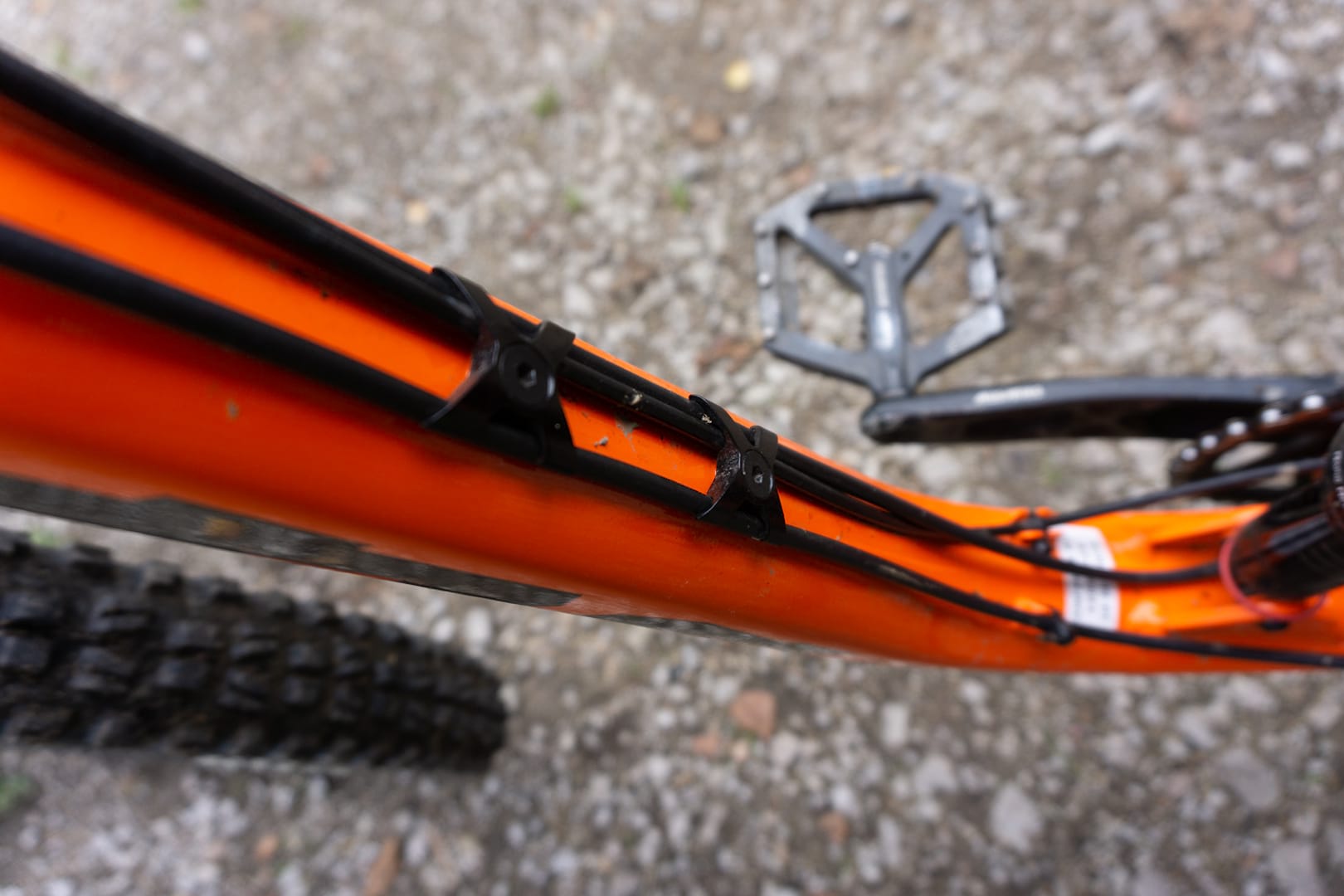The frame uses fairly conventional tube profiles, with some clever tweaks. The curvy down tube creates a big space in the front triangle, and the external cable guides double as mounting points for a bottle cage (or is it the other way round?). There’s internal cabling at the rear triangle to keep your shifting sweet and annoy your local bike shop, and on that subject, the BB is press fit, but thankfully made to decent enough tolerances that even several months of riding failed to make it groan.