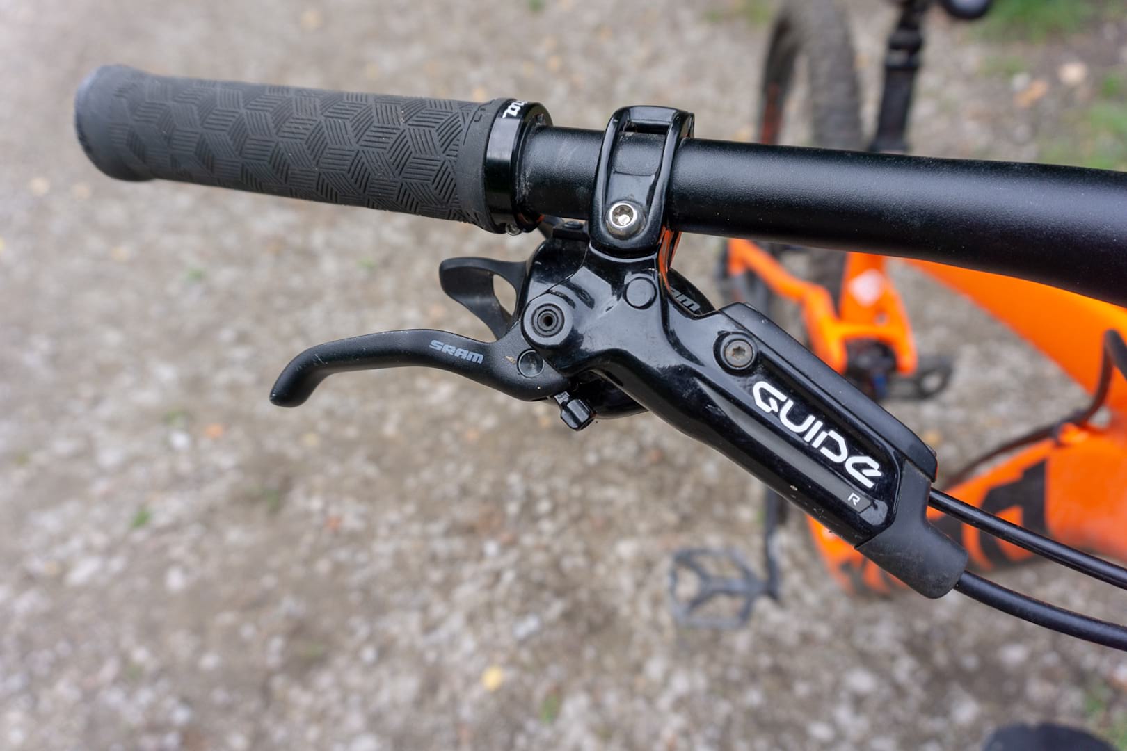 The build kit the bike comes with is standard, unflashy fare. A short stem holds 760mm wide bars and Kona’s own lock-on grips. SRAM’s Guide brakes are decent enough, and have tool-free reach adjust. The Rock Shox Reverb dropper post should be a highlight, but unfortunately it’s only the 125mm drop version, a point which I’ll return to later, and comes equipped with the old-school over-the-bar plunger remote. For me, this type of dropper lever isn’t a deal-breaker, but some other riders may not get on with it at all, and at £90 for a 1x remote upgrade, it’s a bit of a turn-off. There’s even already a mount for an upgraded remote on the brake lever clamp.