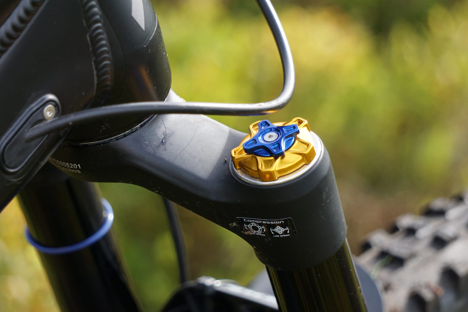 With 15 clicks of high speed damping available, and 15 clicks of low speed, I decided to back off the low speed to get maximum small bump sensitivity, and set the high speed somewhere in the middle allowing me plenty of adjustment either way. Rebound is set using the dial on the bottom of the damper leg and has a massive 34 clicks of adjustment. Giving the fork the old workshop bounce test I set rebound a couple of clicks past the middle, which also gave me plenty of adjustment either way for on trail tuning.