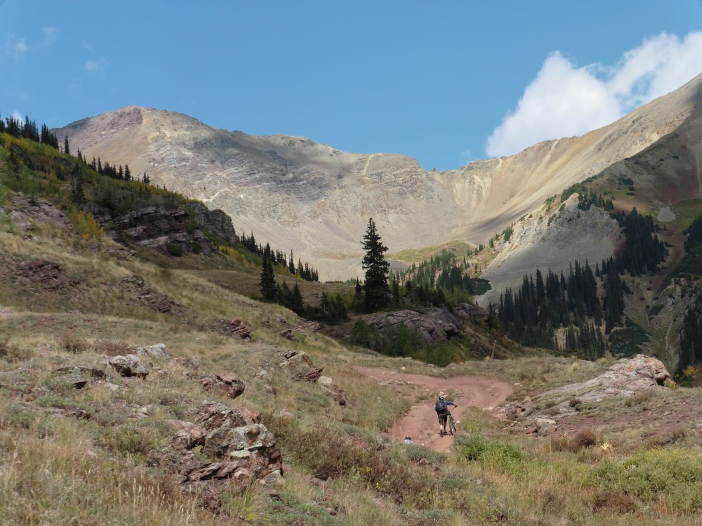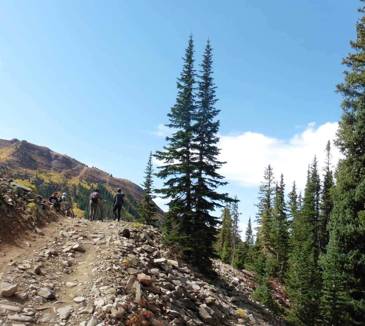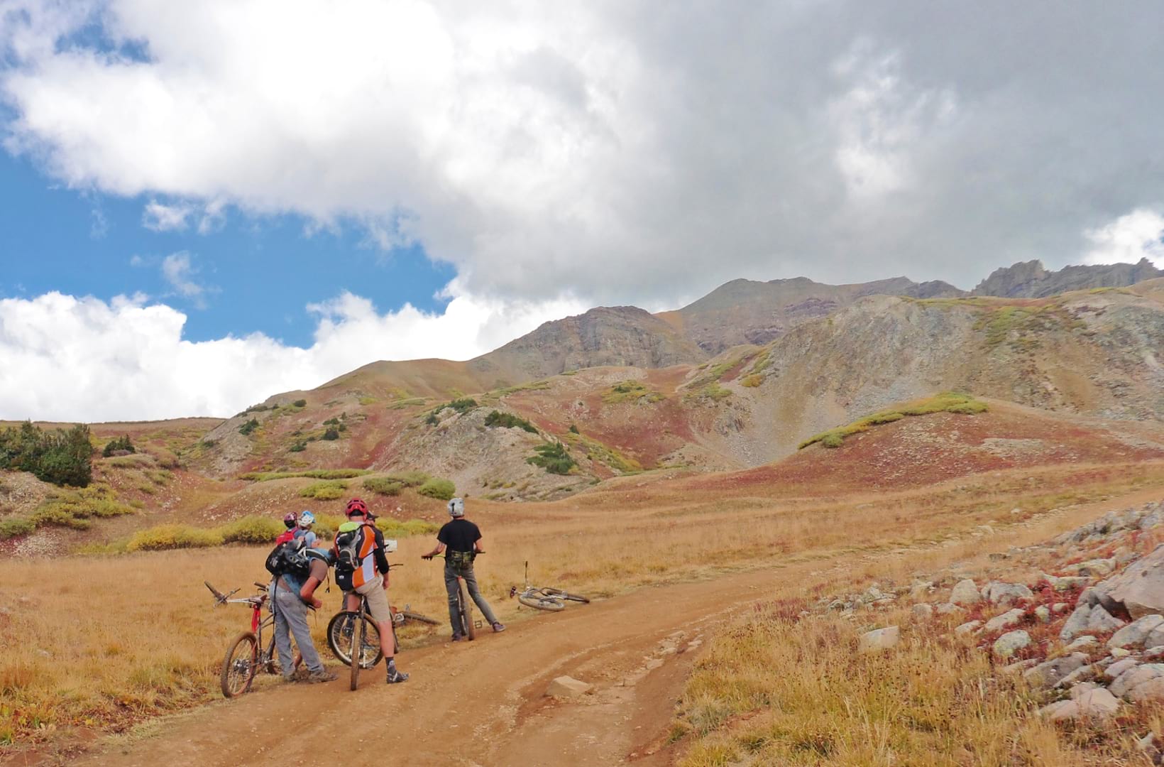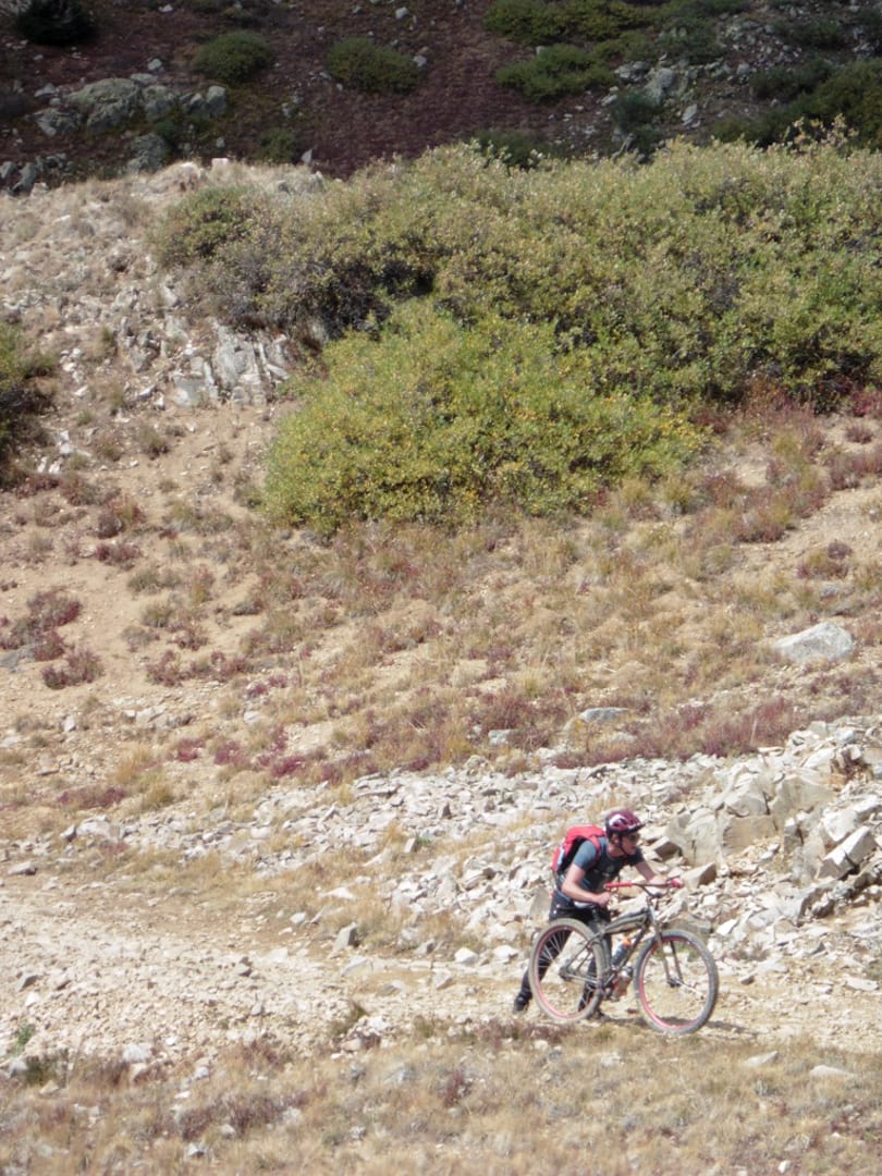 Even though I no longer had a bike to use, my presence at the top of Pearl Pass was required for ceremonial purposes so I hopped into the Jeep with the support driver and we followed most of the riders to the top. The road over Pearl is a challenge for four-wheelers, and drivers actually come from flatter parts of the United States to test their machines and their driving skill. Despite the remote location there is a steady stream of traffic in the form of four-wheelers and motorcycles, three or four an hour while we were on the trail.