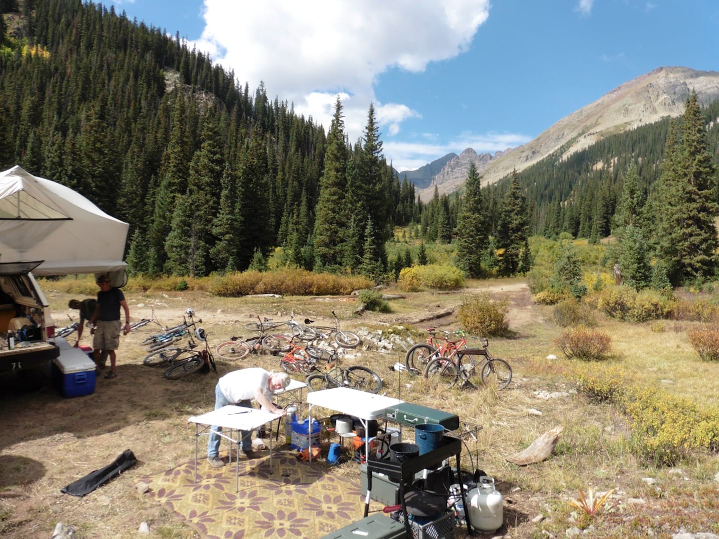 And this was the easy part of the trail, no worse than what I ride on at home. The road ahead had some of the most challenging terrain ever ridden by mountain bikers. I’m not a quitter and pretty tough for my advanced age of 72, but this machine had ‘serious injury’ written all over it. I rode and pushed most of the way to the camp, 18 miles out of Crested Butte, but when the sag wagon caught up, I threw in the towel and put the bike on the back for the last couple of miles. From that point on I was a passenger.