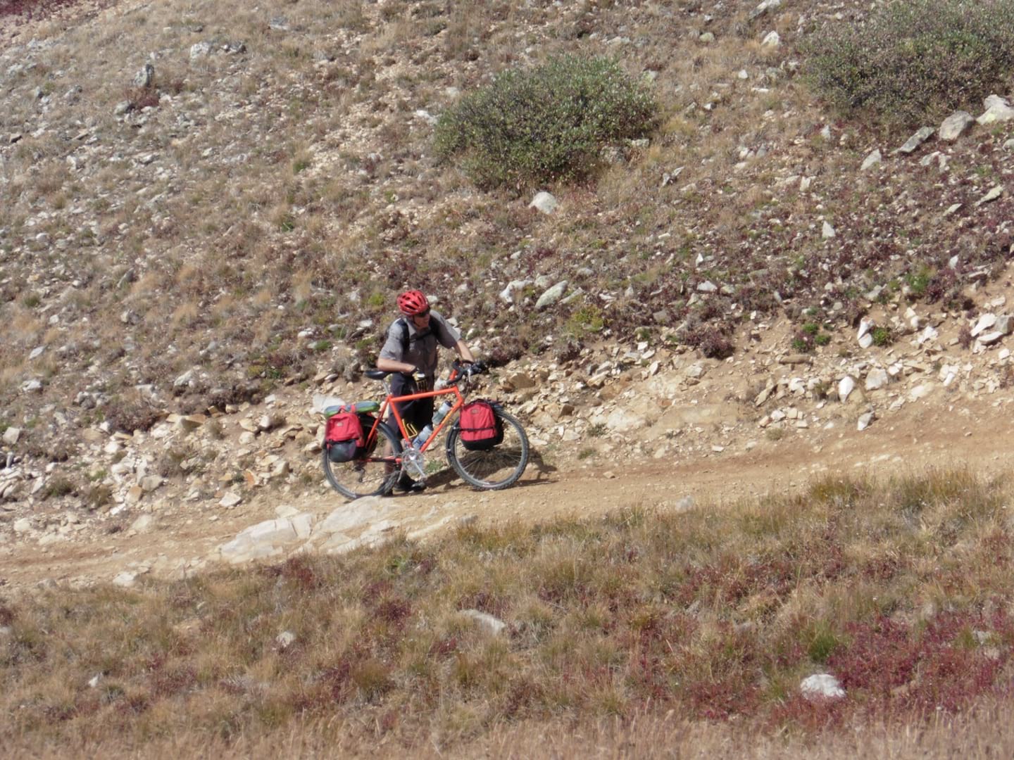 But I’m a good sport and I was there, so I figured at the least I could ride it up to the camp 18 miles and 2,000 feet of elevation away. I was doing all right, keeping up with the back end of the ride, until the first minor descent. My ride was equipped with wimpy caliper brakes, and the frame was actually a modified cheap road bike widened for the bigger tires. This was not even the worst part of the track, and the short wheelbase made the bike uncontrollable. It didn’t have brakes either. Hauling on the levers with all my strength barely slowed it down at all. I kept waiting for one of the 35-year-old brake cables to pop.