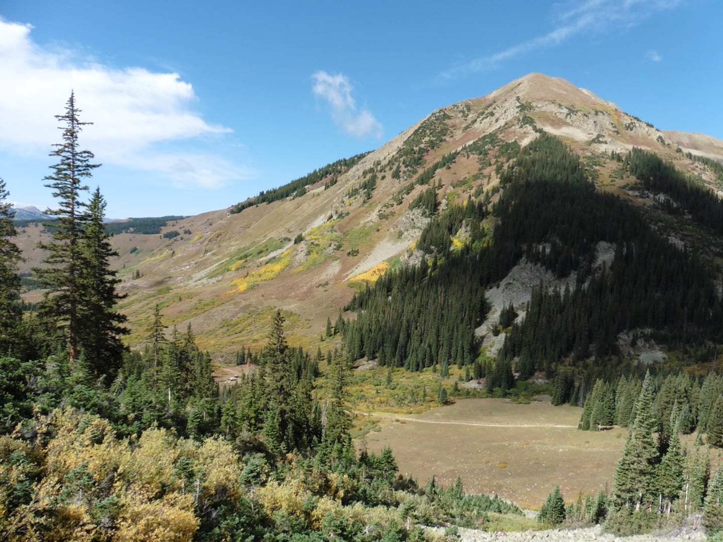 From there the plan was that Joe and Tommy would ride into Aspen, and I would go back to Crested Butte and pick up the rental car to meet them there. Some of the riders were also returning to Crested Butte to pick up their own cars, so my driver and I acted as the sweep vehicle to make sure everyone got back. Even though it is mostly downhill and the surface is better than on the Aspen side of the pass, it was a challenge, especially for one rider who had come from Kansas, where the worst road in the state is better than the one he was on. We stopped several times while riders walked down particularly rough sections. And we stopped to help the Kansas rider fix a flat and made sure he reached the paved road into Crested Butte, then my driver dropped me off and I picked up the rental car to drive to Aspen to pick up Joe and Tommy.