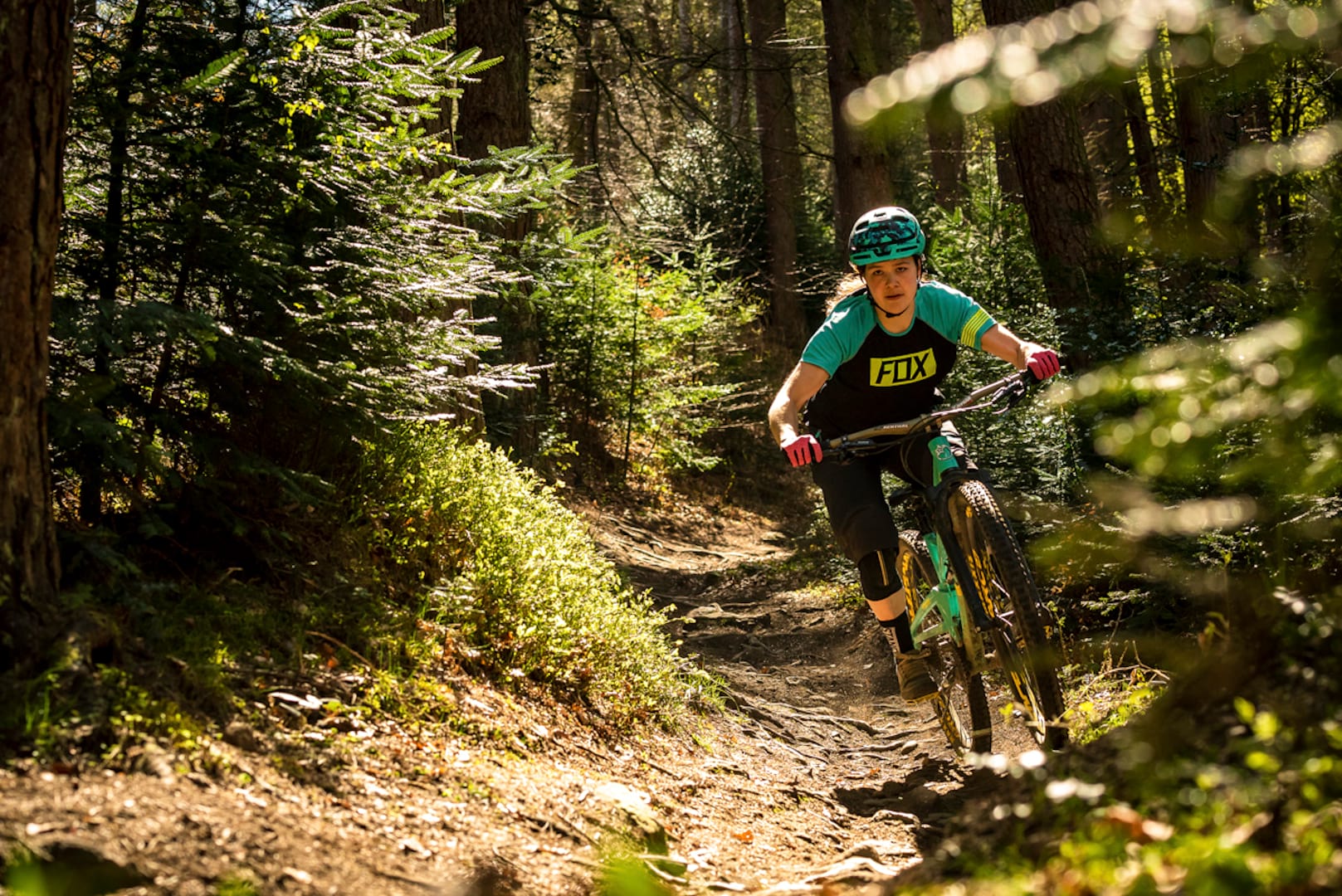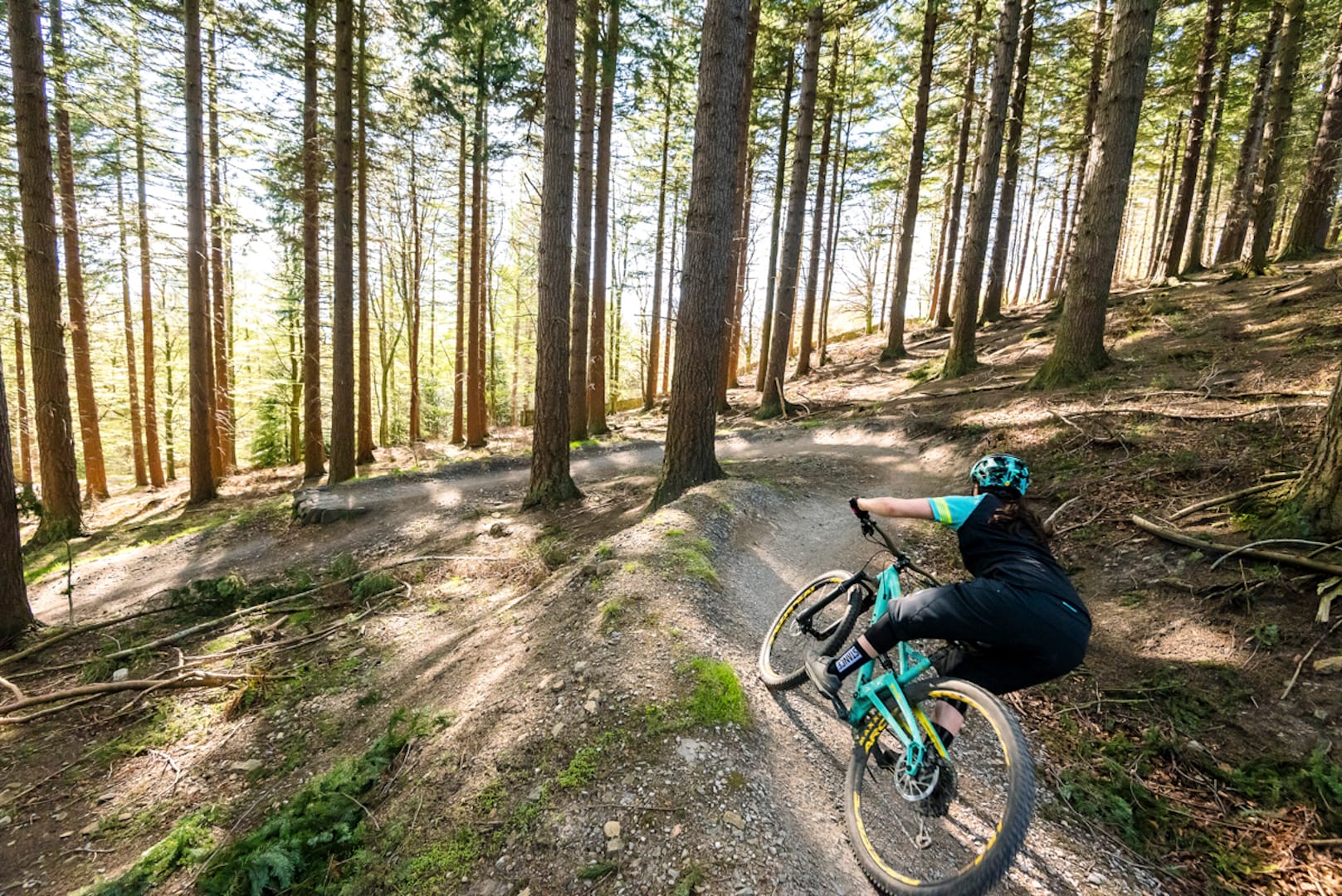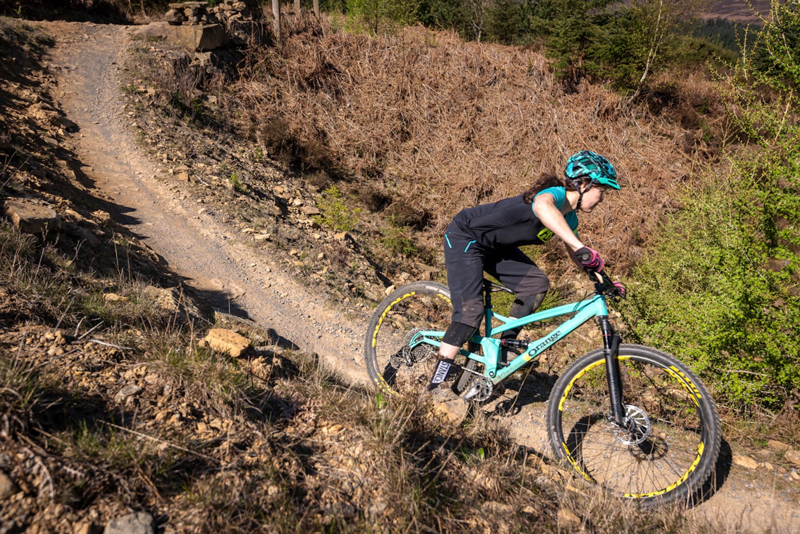 With its wide bars, low BB and long front centre, the nimble Stage 4 is eager to dissect tight and twisty trails. The combination of its go-fast geometry and low-riding chassis means that it loves to corner hard and fast, and within the first few turns I was dropping the inside grip as low to the ground as I could possibly get it. Providing the trail surface isn’t gloopy, there’s great cornering traction from the tubeless Maxxis rubber, giving the Stage 4 oodles of confidence for pushing into the turns.