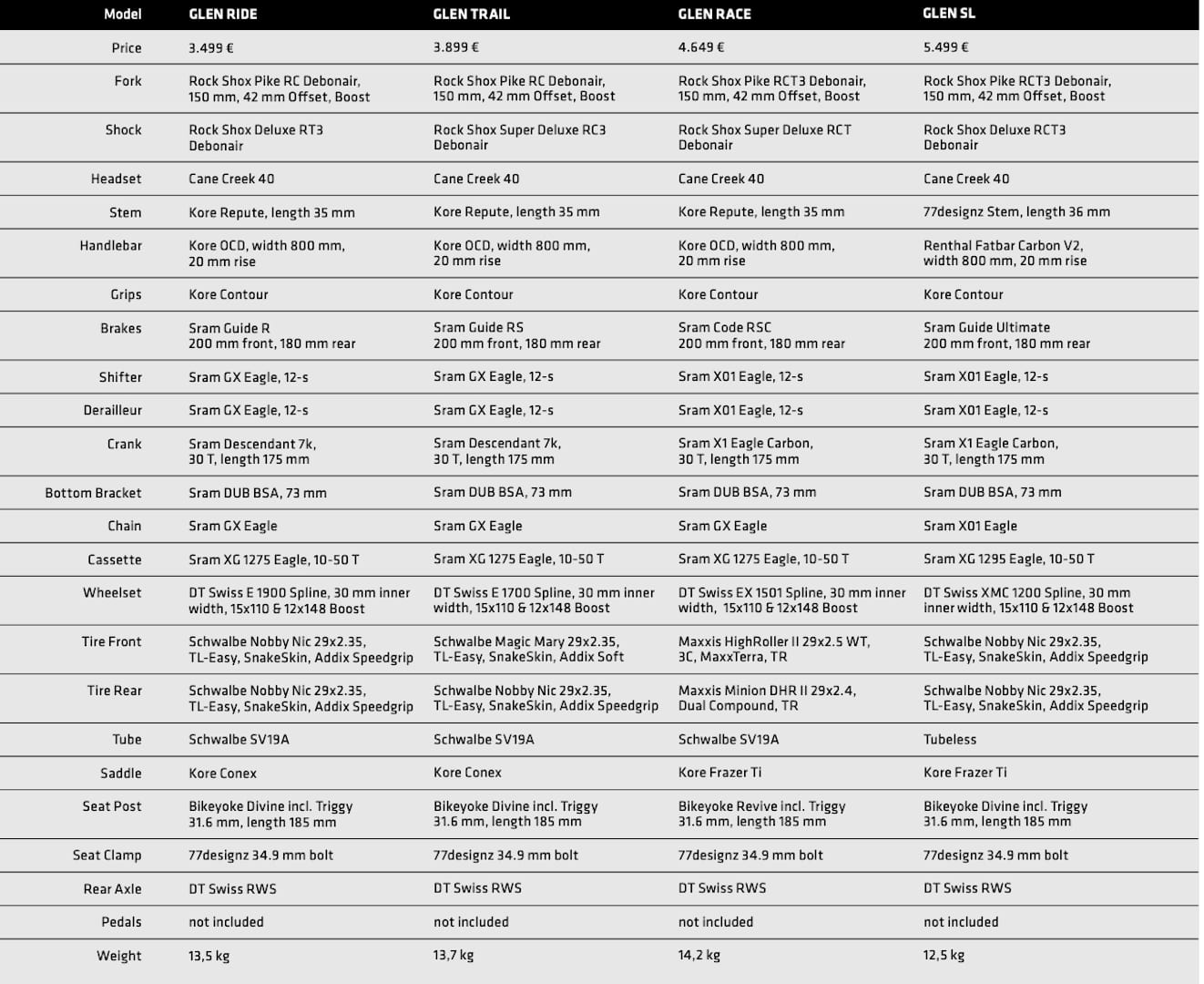 The GLEN is immediately available in four different builds ond three different colors that can be configured in detail to match personal preferences for stem length, handle bar rise and terrain. Wheel sets and tires are available in different strengths to match the mode of application, the riding style and rider weight. Frame sets are available as well.