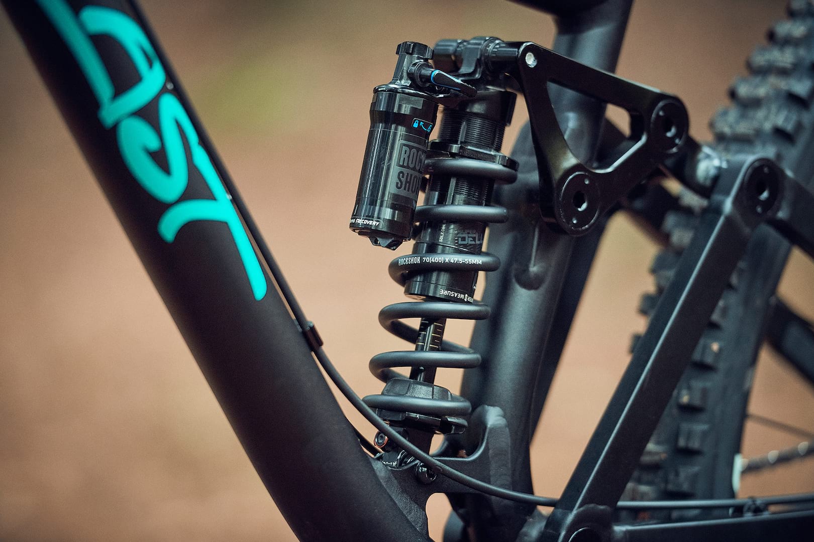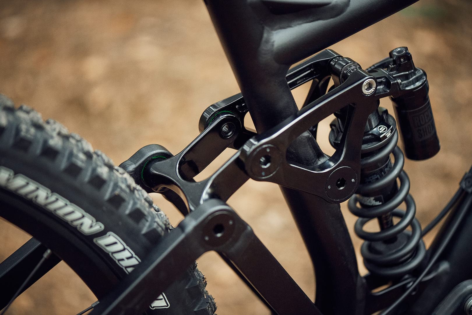The generous installation space enables the installation of most dampers – even with piggyback. The rocker arms keep away dangerous shear forces from the damper. For perfect adjustment, the lower damper mount is milled on the completely welded and heat-treated frame using a CNC machining center. The damper is protected against rockfalls by its position in front of the seat tube.