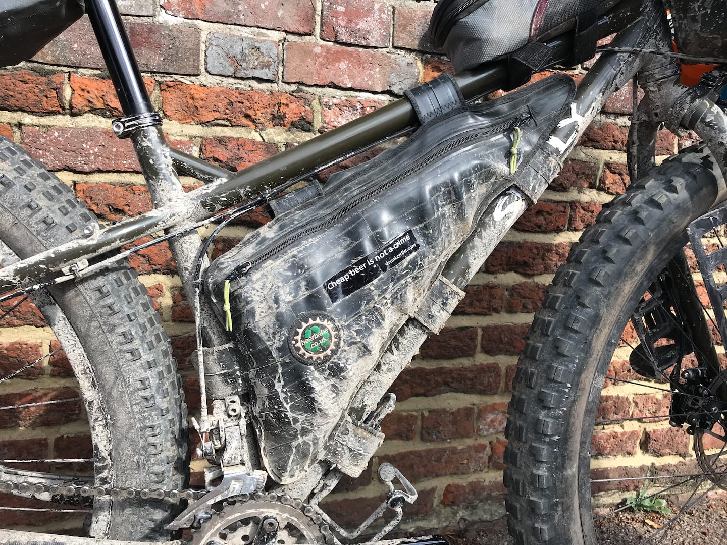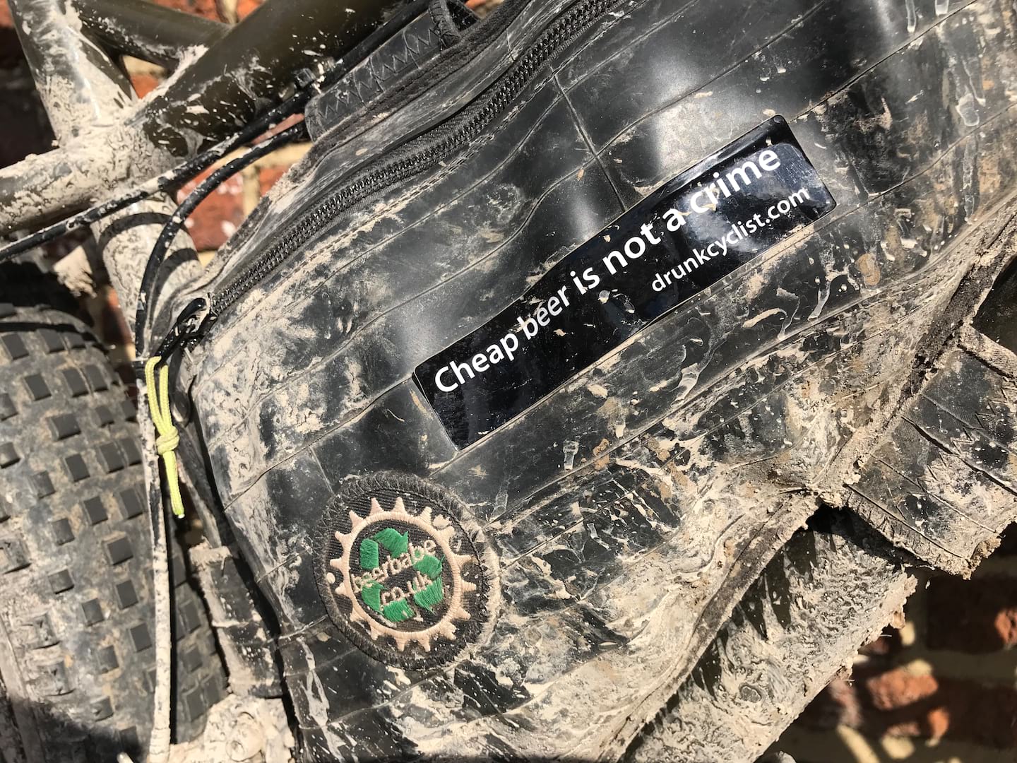 This is a speciality from Judy McNeill aka Beerbabe who is based not far from Box Hill in Surrey. When she’s not out racing her fatbike, Judy is crafting tailor made bike luggage from old inner tubes and malt sacks. She sources the inners from local bike shops like Pilgrim Cycles and also Bike Park Wales for larger quantities, and uses malt sacks from nearby breweries Firebird and Dark Star for the lining. I was fortunate enough to receive one for review at Cycling UK, and it’s only left the frame when I’ve given it a clean. It’s cavernous despite its size and kept my kit dry through all sorts of deluges.