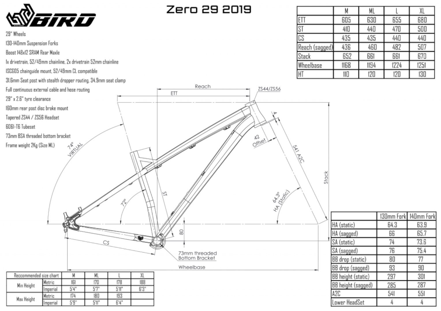 Bird has played around with chainstay lengths on the Zero Twenty Nine too with the smaller 2 size options running a 435mm backend while L and XL frames grow slightly to 440mm.