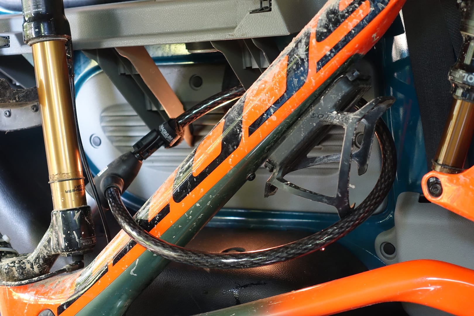 If someone was still going to try to nick the bike out of the car, I was going to make it as painful a process as possible. Using a thick, woven steel cable lock, I locked the downtube of the frame to the car chassis. Obviously the wheels could be taken on their own, but it was the exotic carbon frame and all the other bits bolted to it that I was more concerned for.