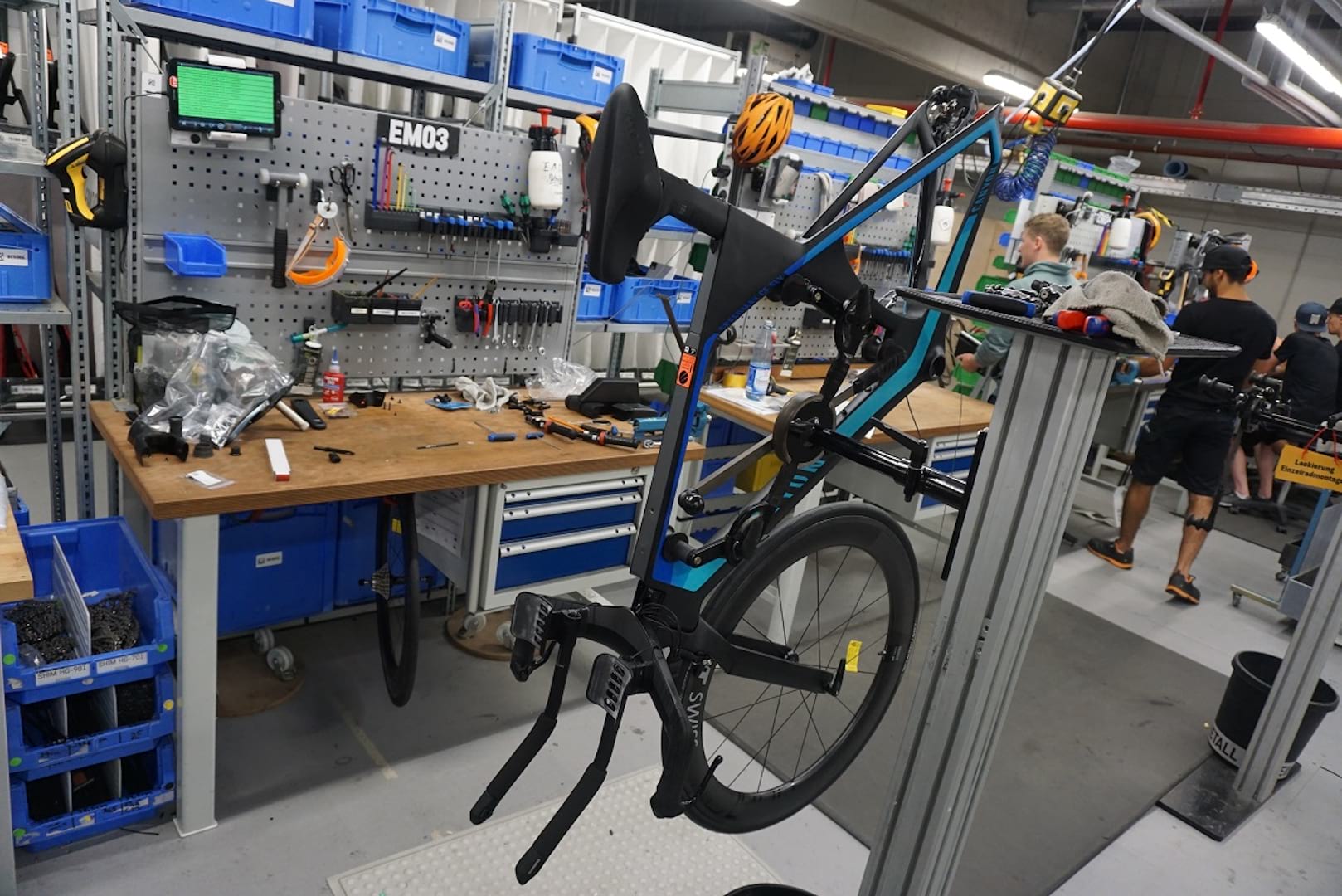 Moving upstairs, I get to see where the assembly process is perfected. Different bikes require different solutions. Take internal cabling as an example. As someone who has tried this themselves at home, this can be a royal pain in the neck. At Canyon, design features like internal routing guides are built in from the start with a view to ease of assembly. In one corner, I see the team working on Canyon’s time trial bike, the Speedmax. It looks pretty complicated stuff as I watch the team install the integrated aero brake callipers. The Speedmax is the only model that isn’t assembled on the standard production line. On average, Thorsten informs me, each trained and experienced mechanic will build around 14 of these bikes each day.