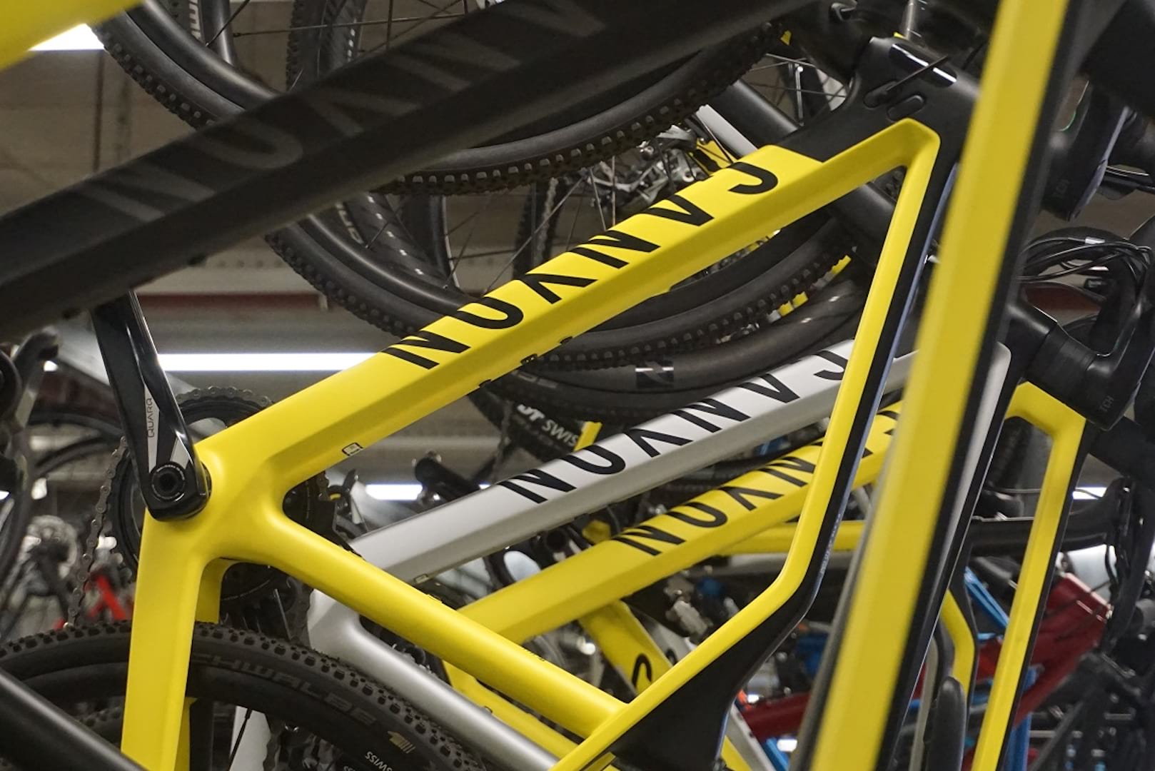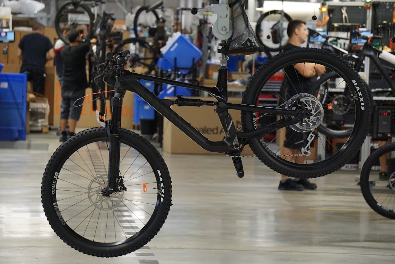 Like Charlie entering Willy Wonka’s factory, I am eager to see what lies through the next door and the door after that. First off, I am taken through the assembly line. It is here that each Canyon bike is assembled and checked before it is boxed up, ready to ship to the customer. Clean, calm and efficient would be adjectives best suited to describe what I see. An automated line above our heads carries each frame past a line of operatives who go about assembling each bike. One attaches the gear cables, another the disc brakes, yet another the bars and stem and so on. Every part of the build is broken down into a simple process where hands and tools flash in front of me with practiced ease. On average, each task is given 75 seconds to complete. “What if they need more time?” I ask. Thorsten and Johannes smile and point to a black ball on a cord at each workstation. “They pull that and it gives them an extra 10 seconds every time they pull it”. Scanning around the line, I don’t imagine it gets pulled very often.