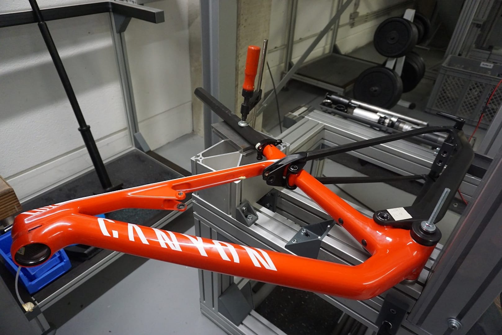 Tucked away in a corner of Canyon Home is what I reckon is the really cool stuff. In the research and testing labs, there are all manner of contraptions and machines whose jobs are to design, develop, build, test and destroy frames and parts long before they are released to the buying public. I’m shown round by two of Thorsten’s colleagues and as you would by now expect, their English is impeccable. Only one item is off limits – a prototype frame that is kept under cover from the eyes of a prying journalist. However, everything else is fair game.