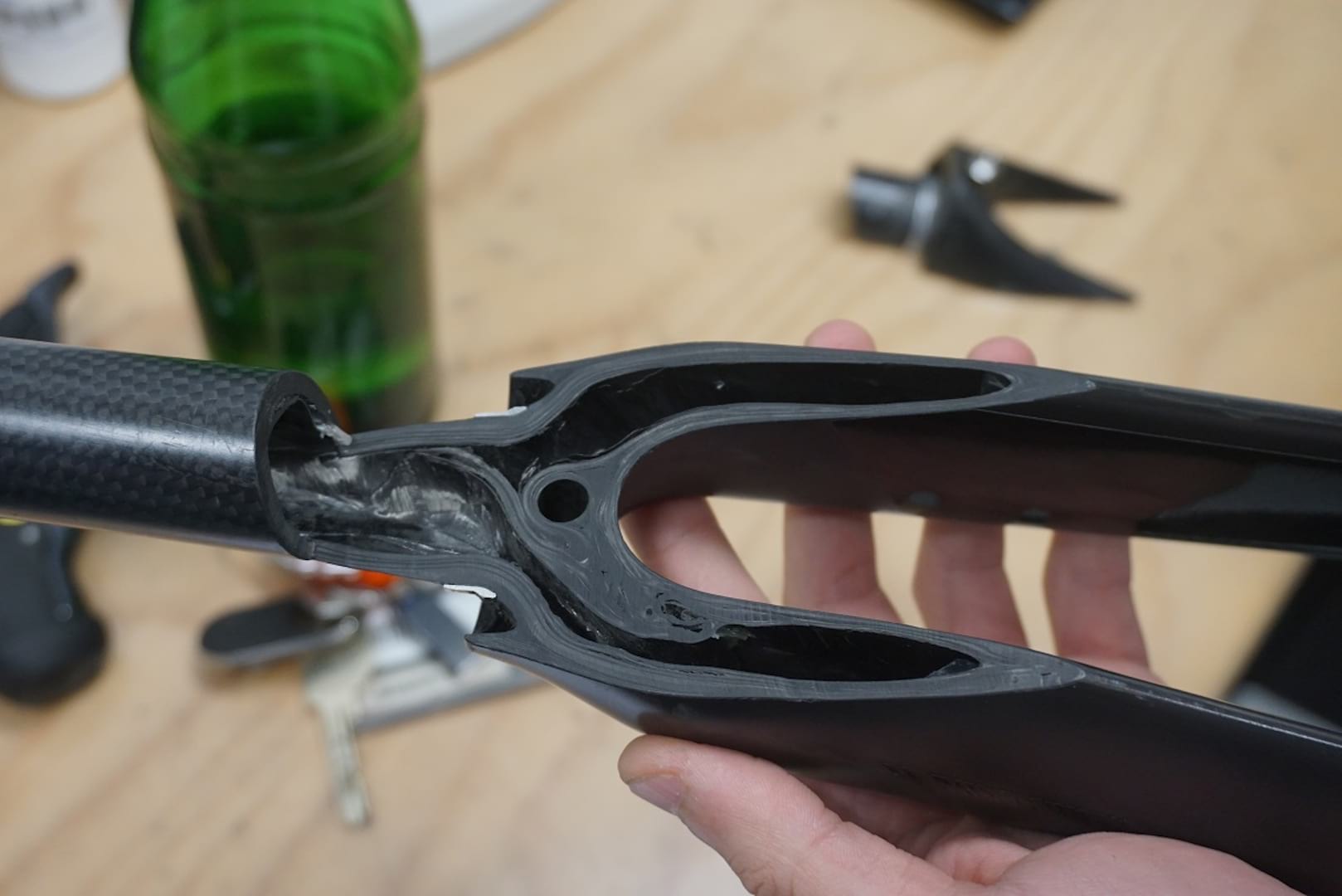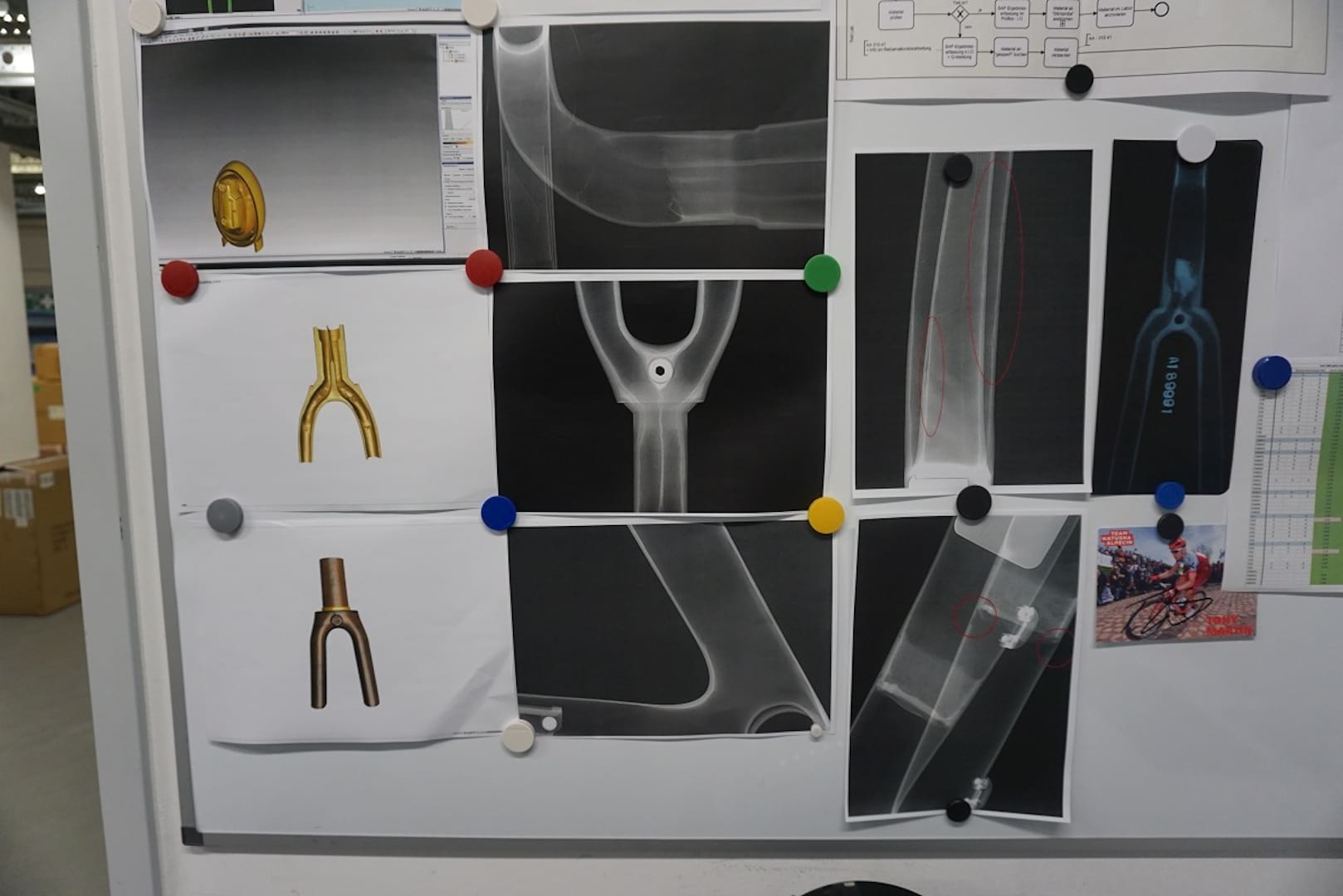 On one of the walls, there are a series of images of defects in carbon parts that a visual inspection would never pick up. I make a mental note to myself never to use a carbon part that hasn’t been subjected to this level of scrutiny. Reading a post on an internet forum from a user who bought a cheap carbon frame or component and has never had any problems isn’t the level of reassurance I’ll be looking for in future.