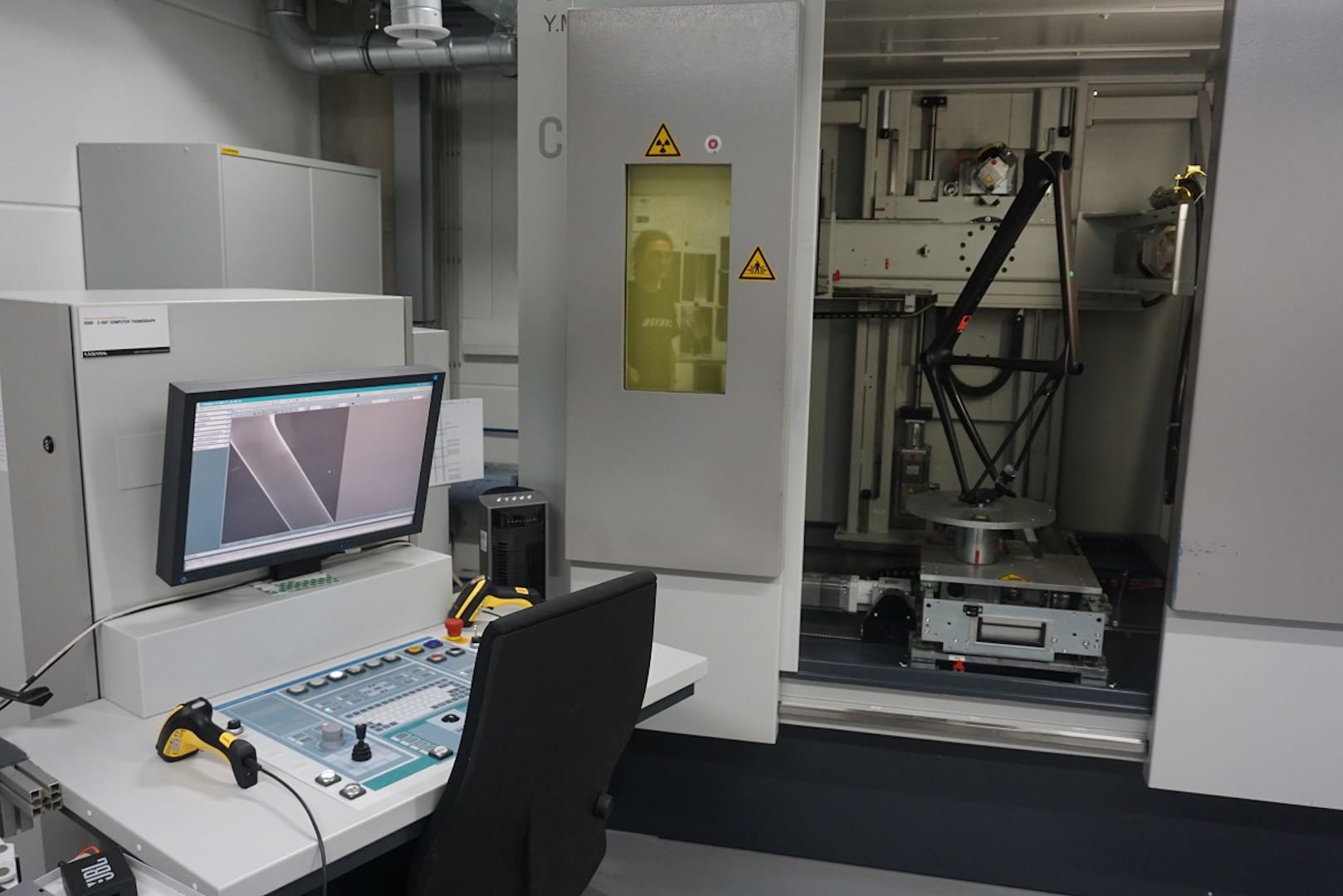Passing by a CNC machine and 3D printer, I am shown to the X ray machine room. Even for a large company such as Canyon, this is a significant piece of kit to invest in coming in at several hundred thousand Euros and one which Canyon reckon marks them out as unique in the bike industry. Moreover, every production partner / supplier that Canyon works with in Asia is required by them to have and use the same X ray / CT machines for testing.