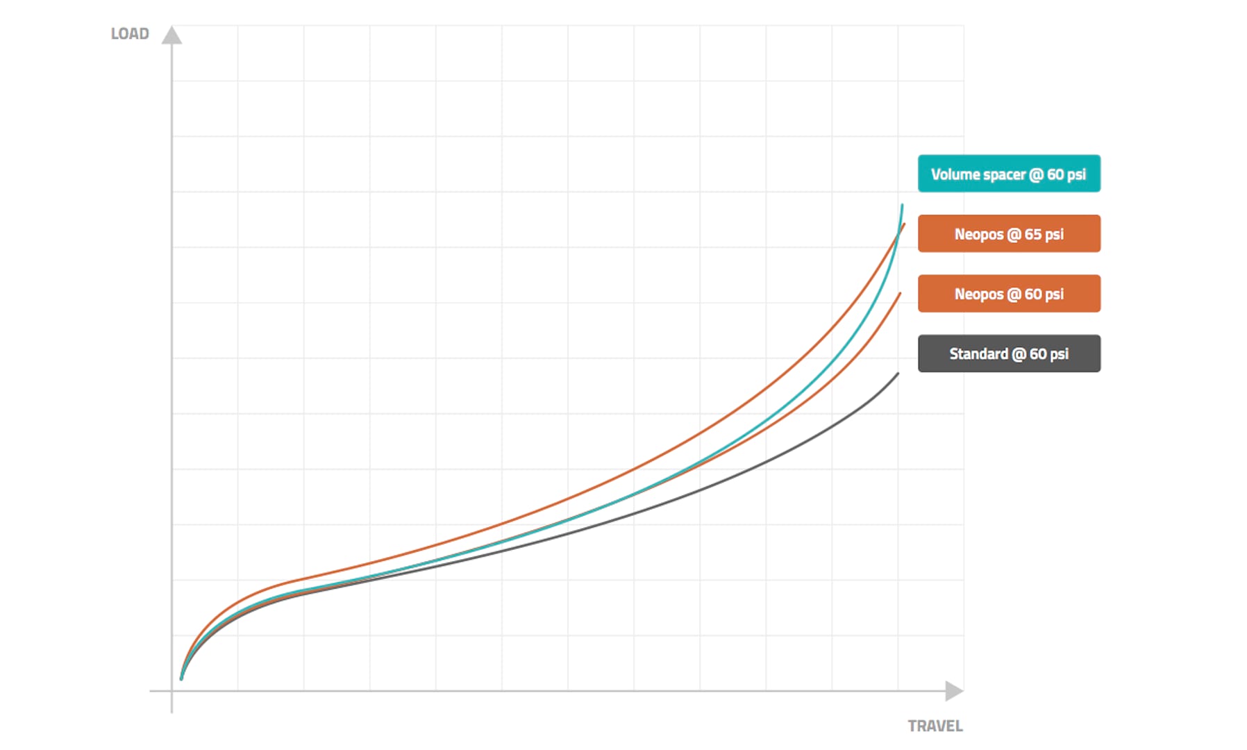 To put it another way, the Neopos spacer helps to ‘linearise’ the air spring curve. It doesn’t make it completely linear like a coil spring, but it does produce a slightly flatter spring curve.