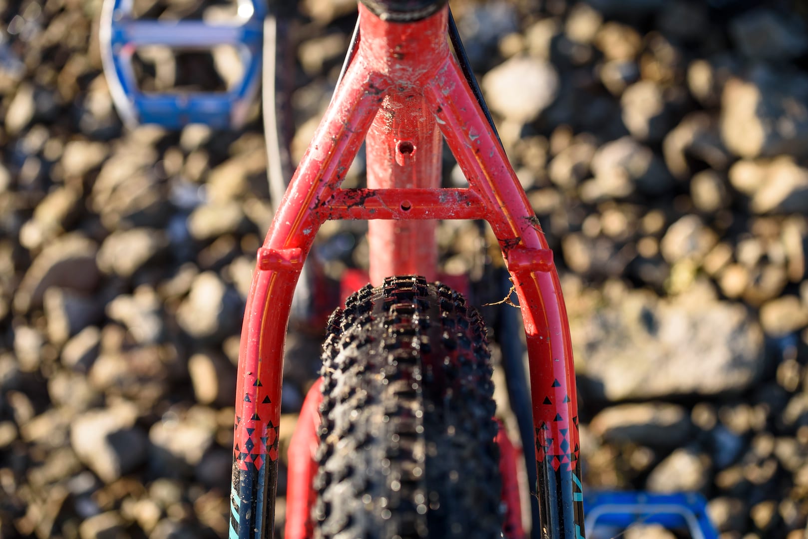 Gear-wise, we have a full SRAM NX transmission, with a giant 11-42T range (though still on a Shimano-compatible Formula freehub for future affordable spares), and up front is a diminutive 28T NX chainset. This is definitely a bike built for low gears and tall hills. The chainstay yoke is a thing of 3D beauty, giving endless mud clearance for the tyre (while also offering a bit of a shelf for it…).
