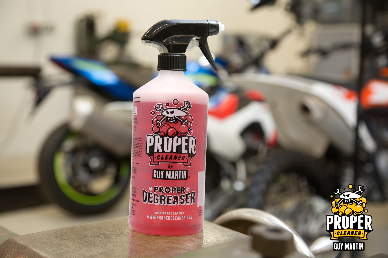 Proper Degreaser, or to give it its full name, “Proper Degreaser from Proper Cleaner by Guy Martin” is released today and joins its existing (and successful) stablemate, Proper Cleaner in a growing range of bike cleaning potions from the Orange-bike-riding, beanie-wearing, Hope-braking modern day Fred Dibnah.