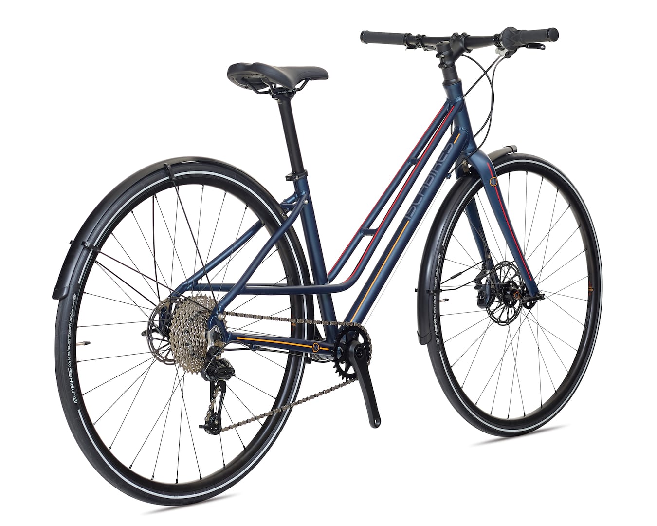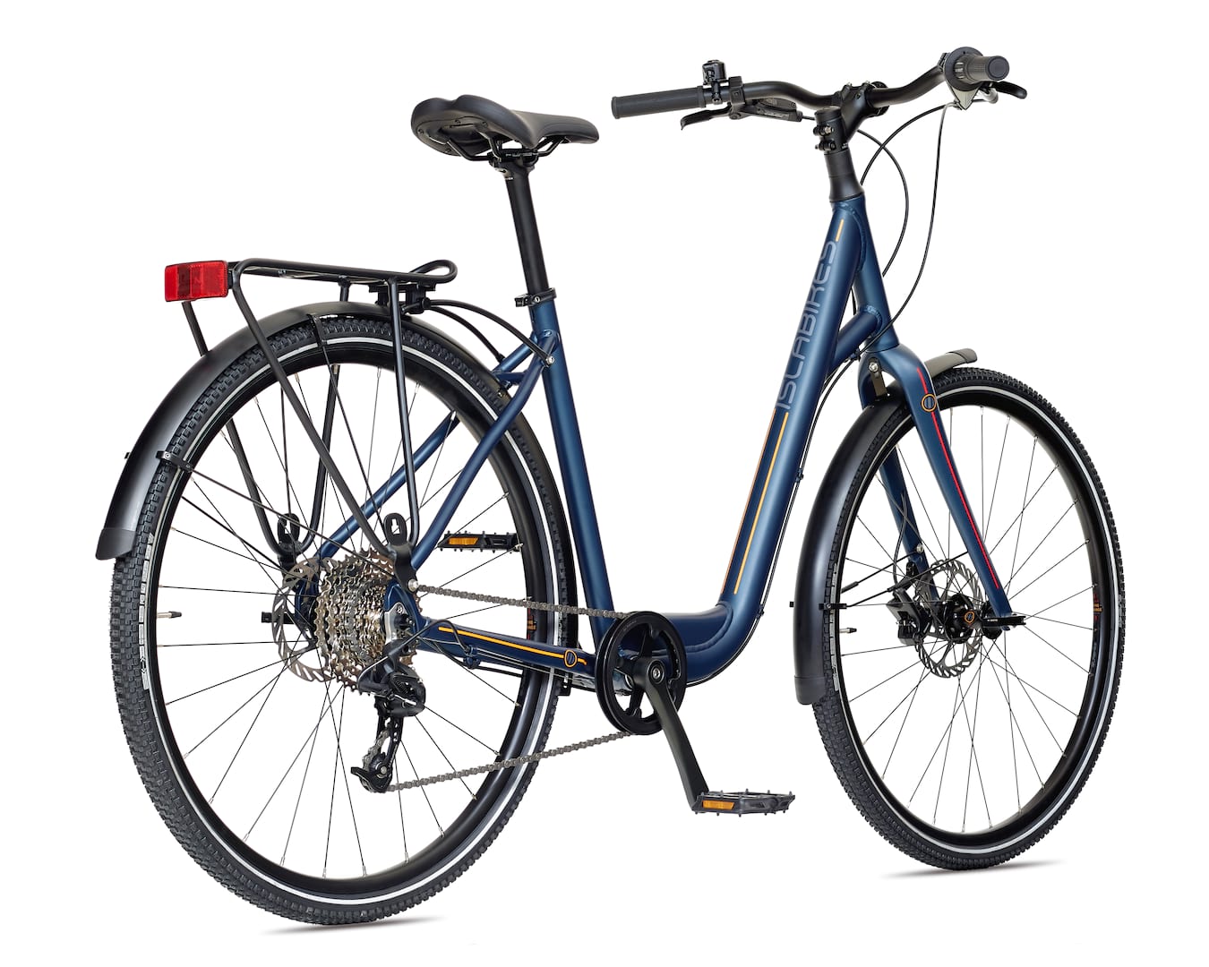 An urban bike for about town and quiet lanes, this features a very low step through frame, an 8-speed 11-40T cassette with 32T chainring, and hydraulic SRAM DB Level A1 brakes. 26inch multi surface tyres, plus mudguards and rack as standard should make for a practical bike. At 11kg it’s the heaviest of the range, but is still a lightweight bike for one of this upright/hybrid style.