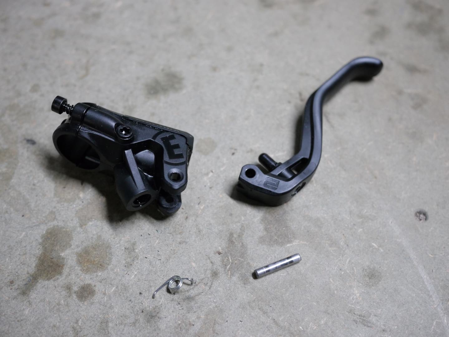 Much later on in this test, I did get a warranty replacement on one of the brakes. Uninstalling the HC lever from the old brake, I was a bit more courageous and tried the hammer and punch method, supporting the master cylinder on a bench vice so the pin could drop through. It was fine and, after triple checking the punch was lined up, went without a hitch (just to get photos of installation for this review, I refitted a standard lever to an MT5 master cylinder)