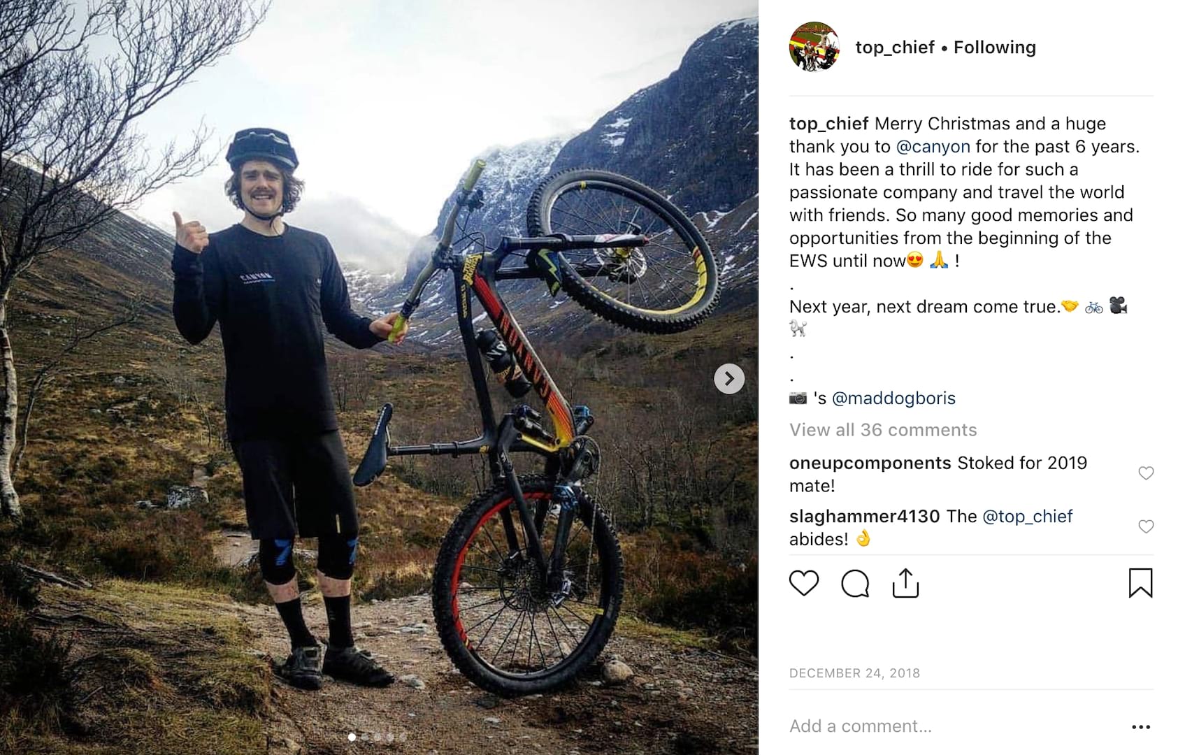 “Merry Christmas and a huge thank you to @canyon for the past 6 years. It has been a thrill to ride for such a passionate company and travel the world with friends. So many good memories and opportunities from the beginning of the EWS until now!
