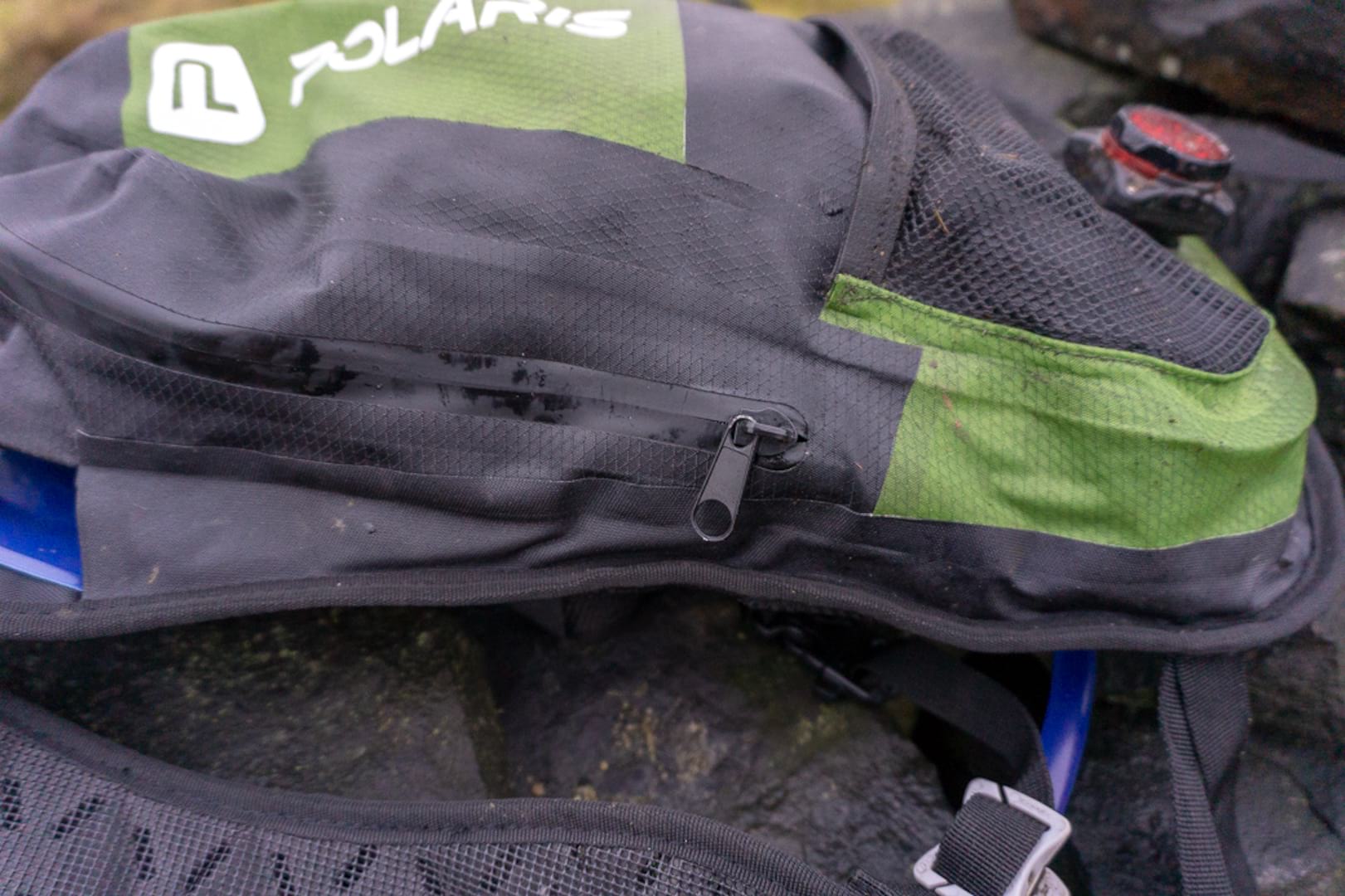 There is a small mesh pocket on the front of the bag together with a loop for a light. Behind the main compartment is an open-topped sleeve that will hold a 3-litre hydration bladder, complete with some hook-and-loop tabs that pair up with Polaris’s own reservoir to stop it slumping down.
