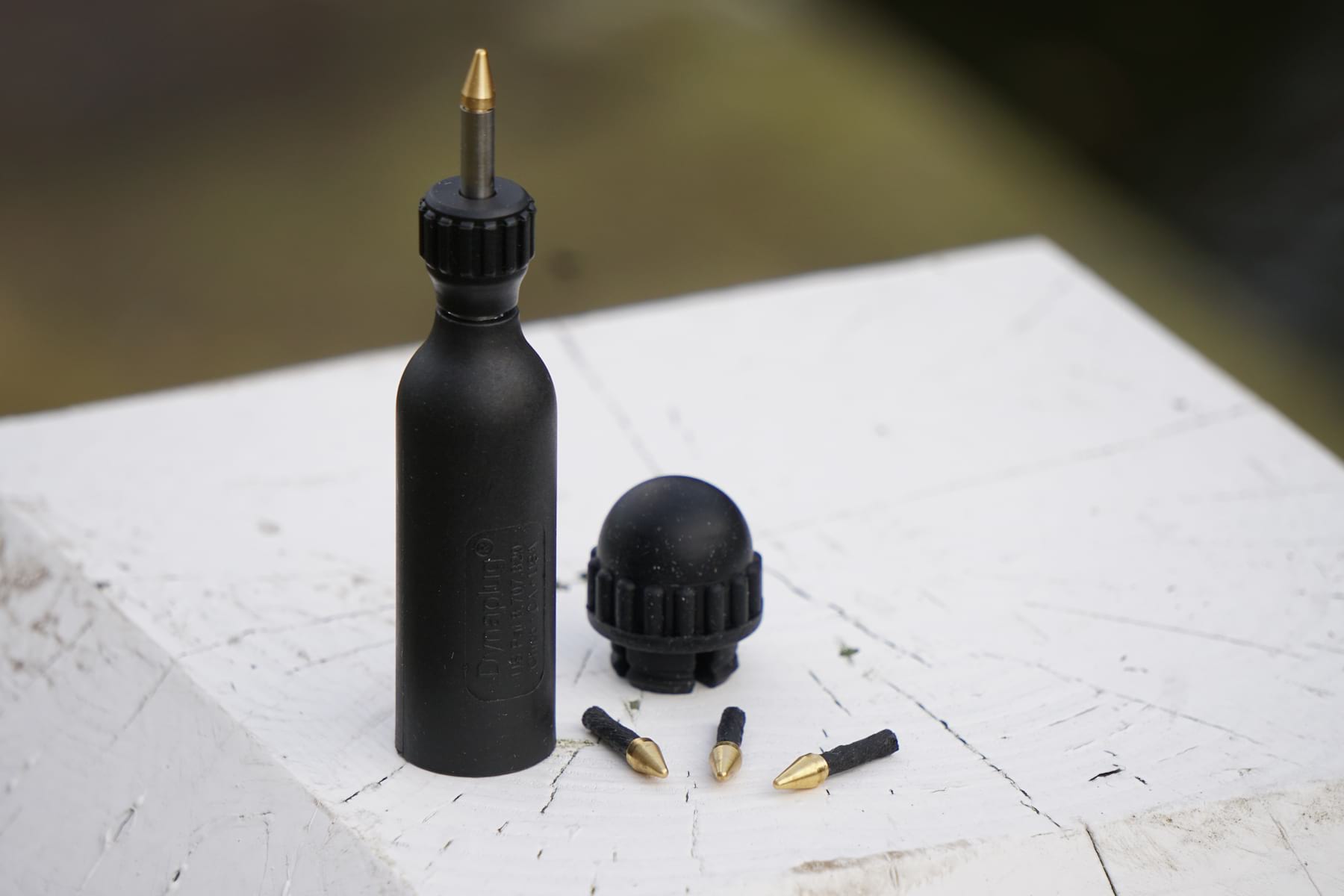 The Megapill is the 7 shooter of the tubeless repair world. The large pill shaped alloy body unthreads to reveal a prong in to which various plugs can be loaded. Around the prong, there’s space for even more plugs so you can be sure you’ll have plenty of sticky rubber on tap for those rocky Alpine rides.