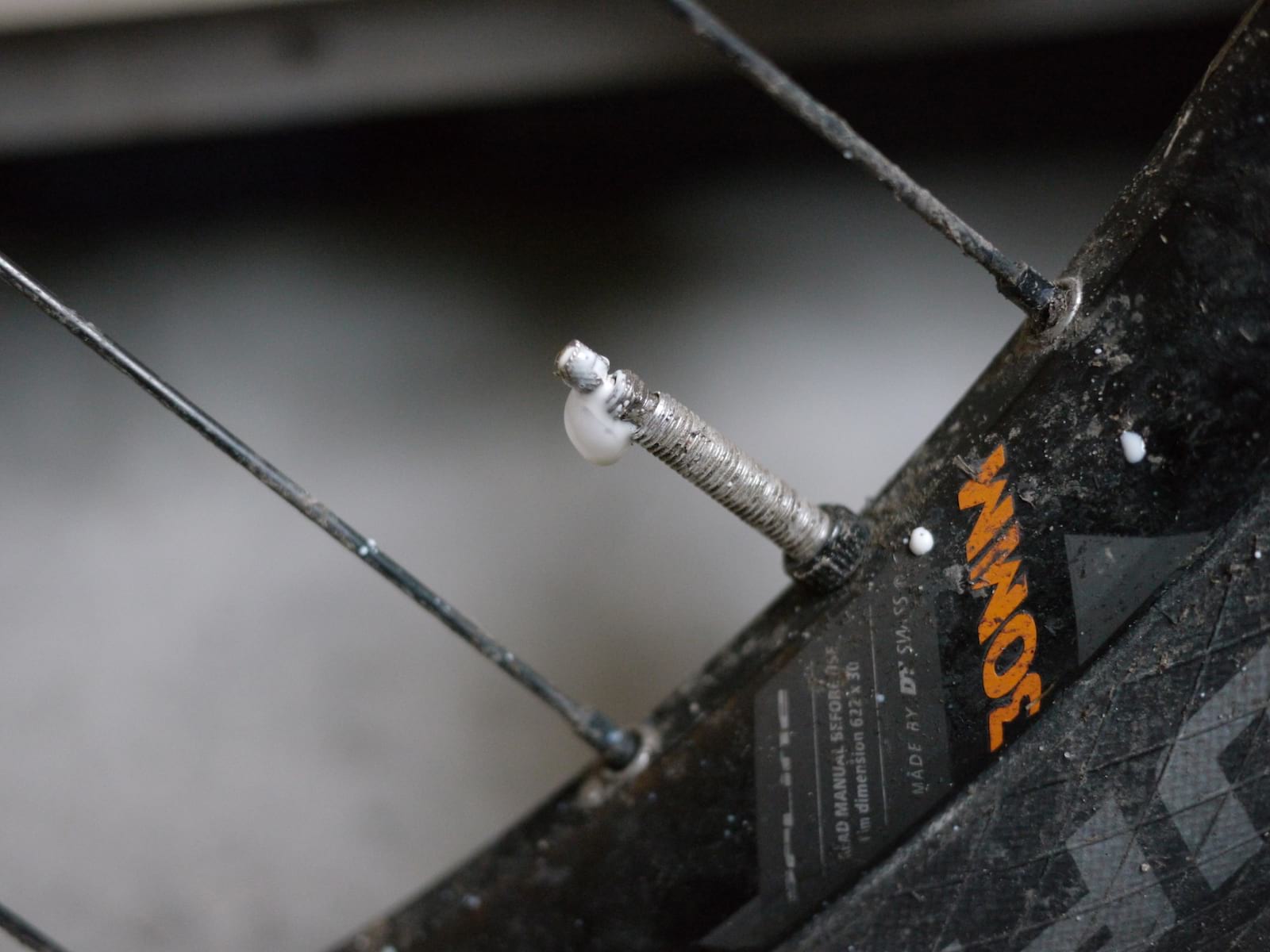 I was assuming I’d damaged the rim tape too, but a second attempt at inflation revealed a leak at the bead in an entirely different spot. Further investigation seemed to indicate the Flat Tire Defender itself was hugging things so tightly it was preventing sealant getting to every bit of the bead. Deflating, pushing that section of bead inward, and dumping a bit of sealant over the outside solved this.